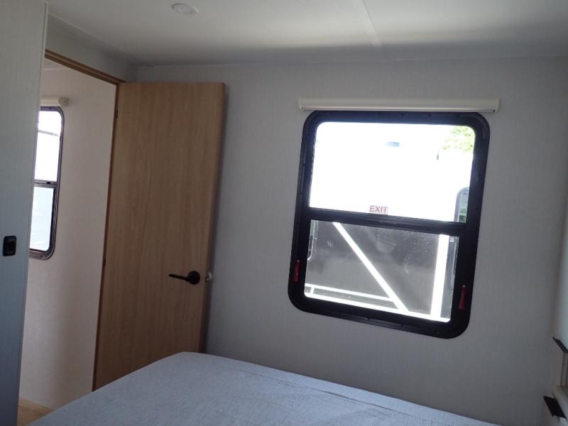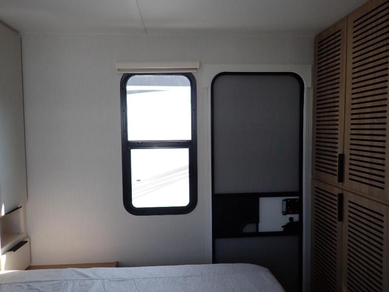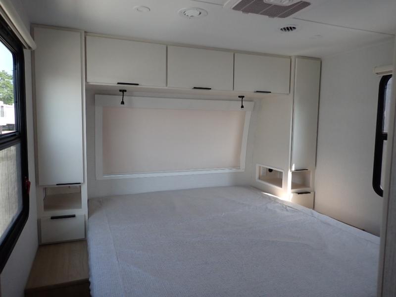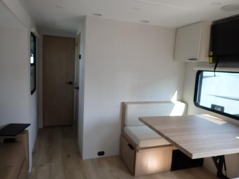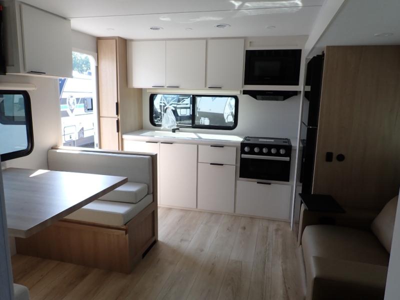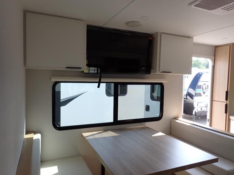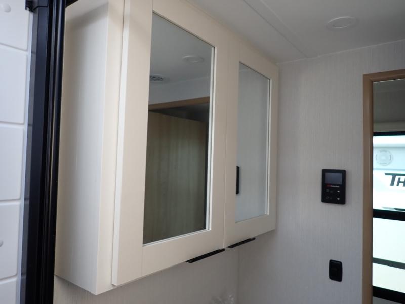 The Thrive™ 24RKS offers smart design and comfort with dual entry doors for easy access. The spacious rear galley features a pull-out pantry, integrated waste and recycling bins, and generous counter space for effortless meal prep. Enjoy extra room in the MegaDinette, which adds 10 inches of seating—perfect for dining, working, or relaxing. The private front bedroom includes an Olympic queen-size bed, a full closet with washer/dryer prep, and a large panoramic window for natural light. The 24RKS is built for travelers who don't want to compromise on home-like features on the road.