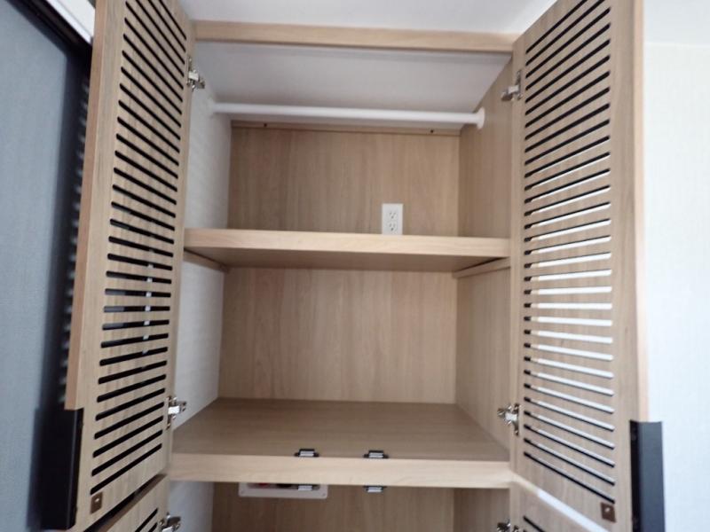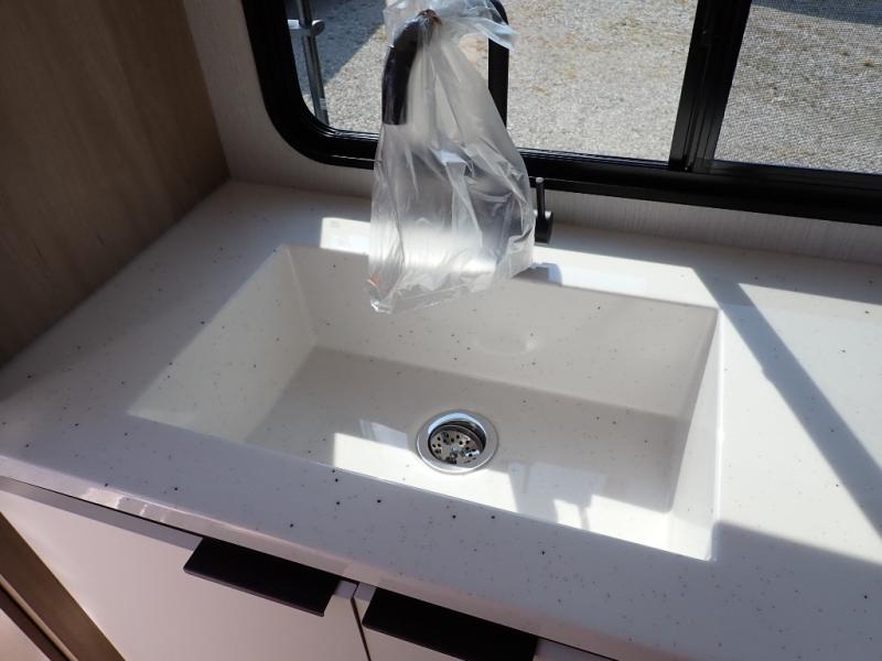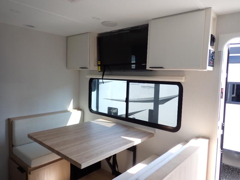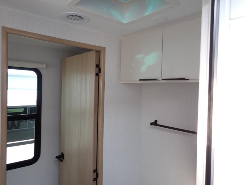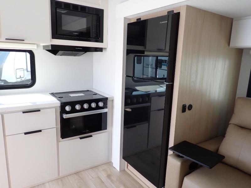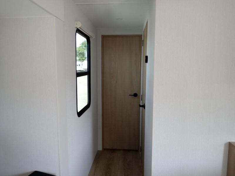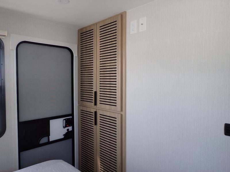 The Thrive™ 24RKS offers smart design and comfort with dual entry doors for easy access. The spacious rear galley features a pull-out pantry, integrated waste and recycling bins, and generous counter space for effortless meal prep. Enjoy extra room in the MegaDinette, which adds 10 inches of seating—perfect for dining, working, or relaxing. The private front bedroom includes an Olympic queen-size bed, a full closet with washer/dryer prep, and a large panoramic window for natural light. The 24RKS is built for travelers who don't want to compromise on home-like features on the road.