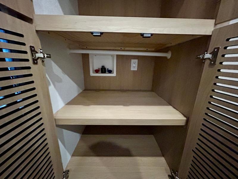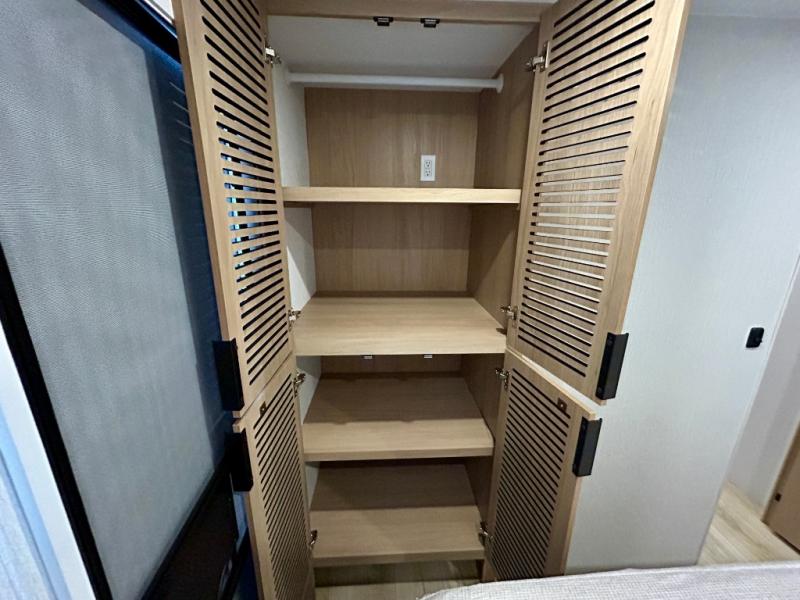 This travel trailer provides both comfort and convenience. At the front, you'll find a private bedroom with its own exterior entry for added privacy and ease of access. The middle bathroom ensures convenient access from all areas and includes a wardrobe with washer and dryer prep. In the main living space, a spacious 42" x 82" Mega Dinette provides a great spot for meals, games, or work, while theater seating across from the TV allows for relaxing evenings. At the rear, the fully equipped kitchen includes a cooktop with oven, a refrigerator, and a pantry with pull-out shelves for maximum storage and organization. A second exterior exit from the kitchen area adds extra convenience, providing both a comfortable and functional trailer.