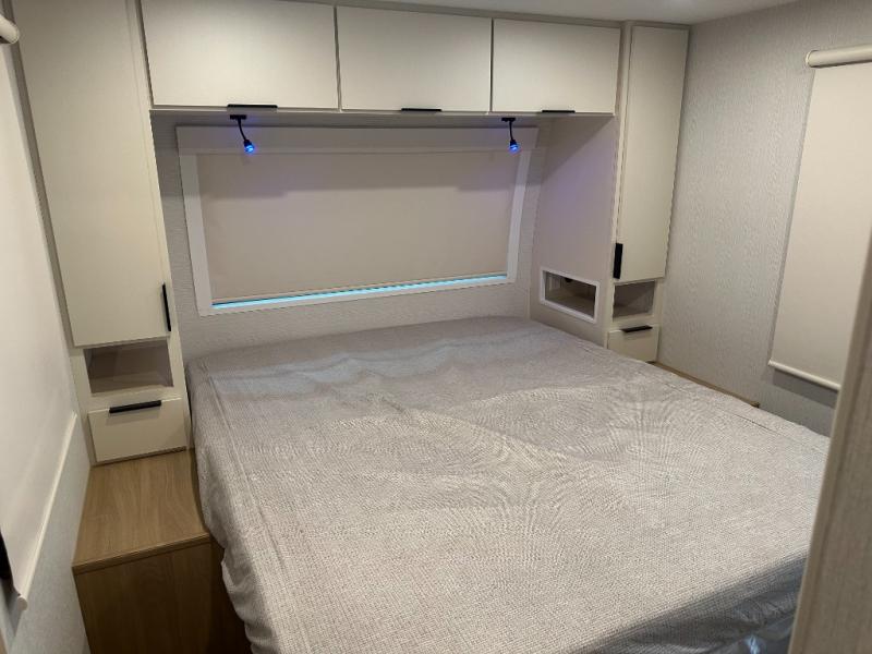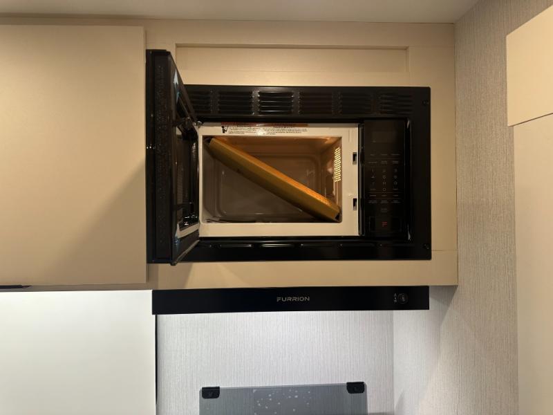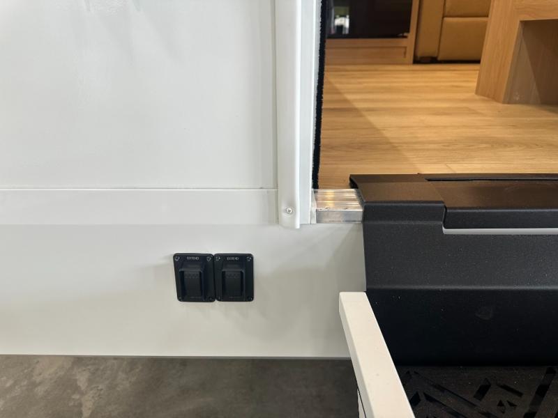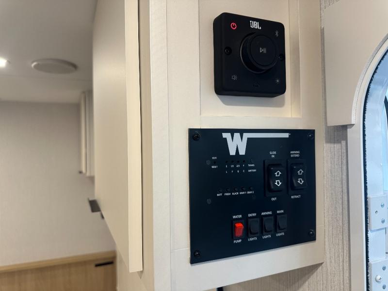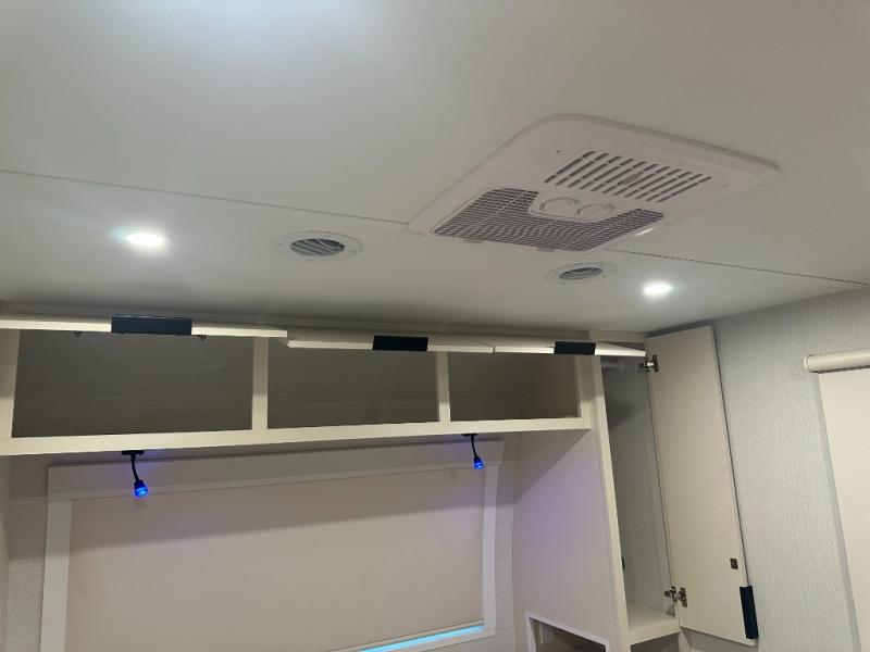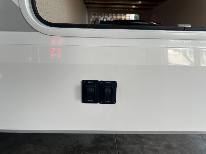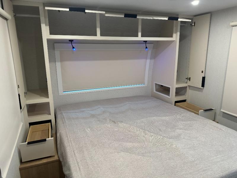 Exterior amenities include an exterior ladder for roof access, front radius profile lights, power stabilizer jacks for quick setup, and a powered awning with LED lighting that creates an inviting outdoor living space, day or night. Stay powered wherever you go with a 30-amp power cord and 200-watt solar panel, and enjoy endless hot showers thanks to the efficient tankless water heater.