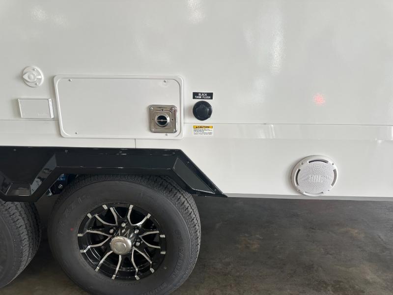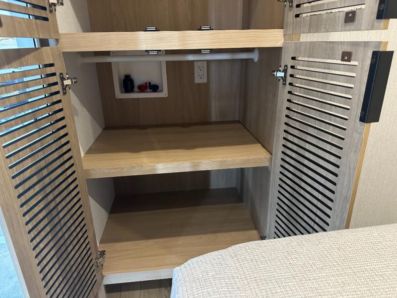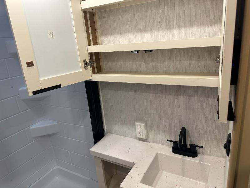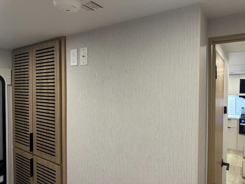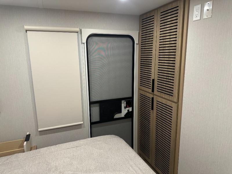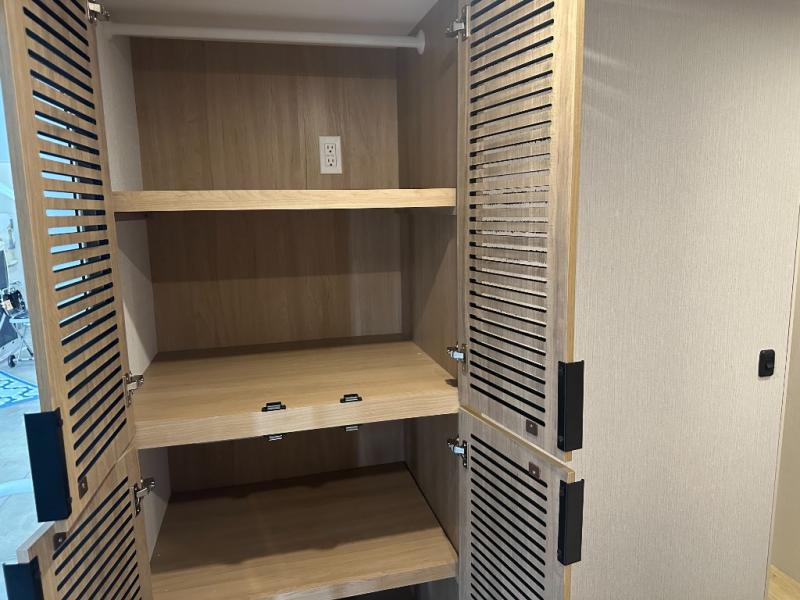 Step into a private front bedroom that boasts its own exterior entry, providing added privacy and ease of access—ideal for quick getaways or late arrivals without disturbing the rest of your group. The mid-trailer bathroom offers excellent accessibility and includes a wardrobe with washer and dryer prep, making it easy to bring home comforts along for the ride.