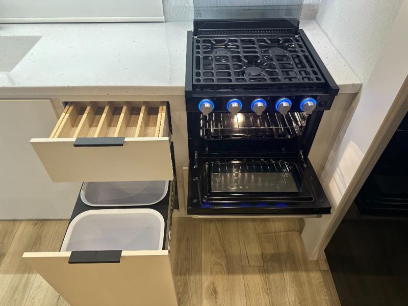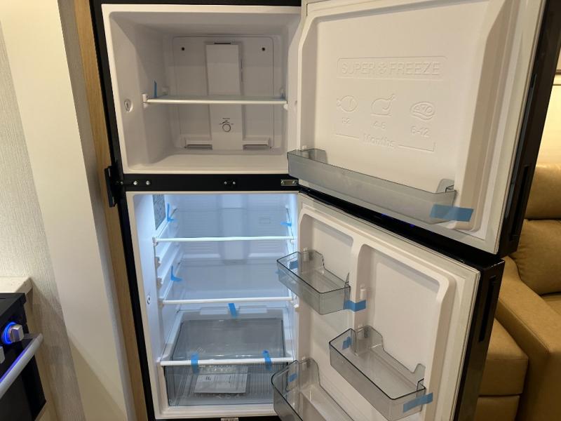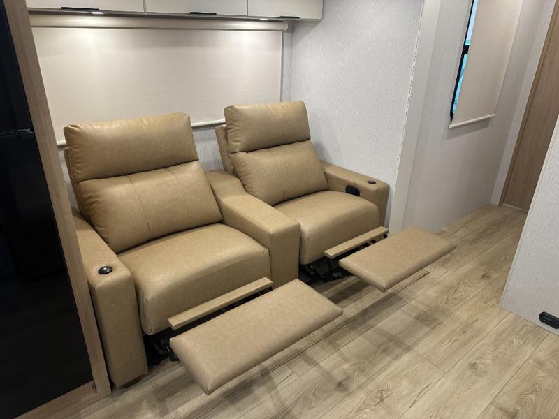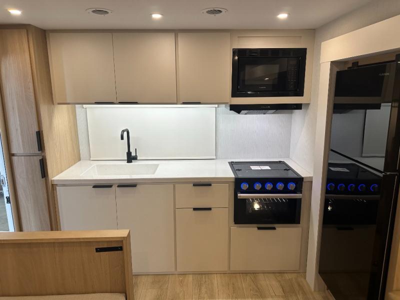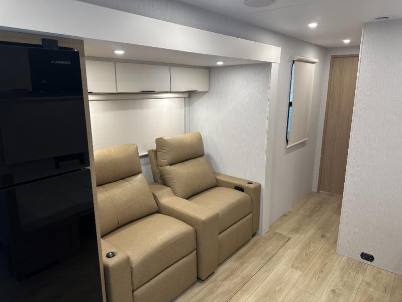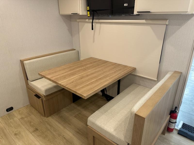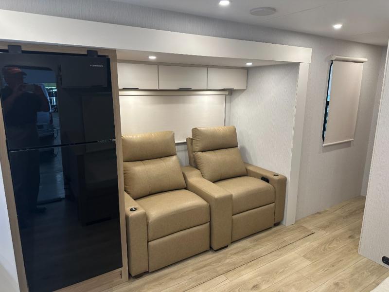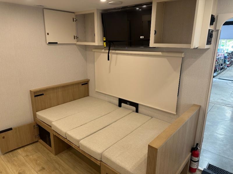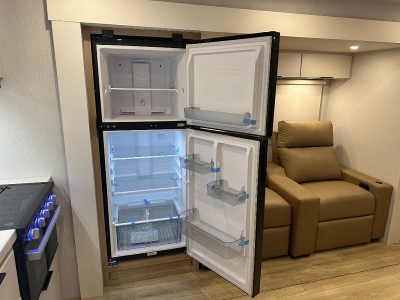 The heart of this trailer is its spacious living area, where a generous 42" x 82" Mega Dinette creates the perfect spot for meals, board games, or even remote work. Relax on the comfortable theater seating across from the TV for cozy movie nights or casual downtime. At the rear, the fully equipped kitchen features a cooktop with oven, a large refrigerator, and a pantry with pull-out shelves that maximize storage and keep your essentials organized. The second exterior exit from the kitchen area adds an extra layer of convenience for easy access and flow.