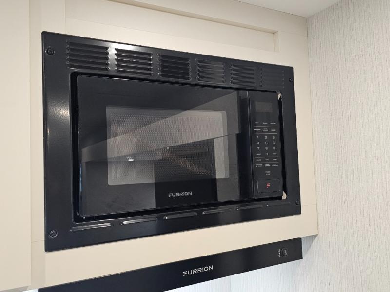 Microwave and deep stainless steel sink with high-rise faucet