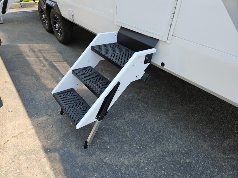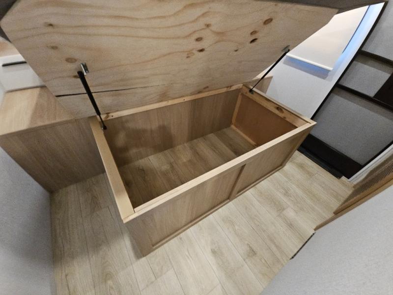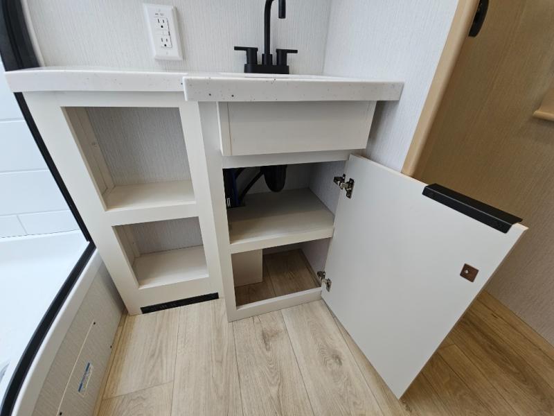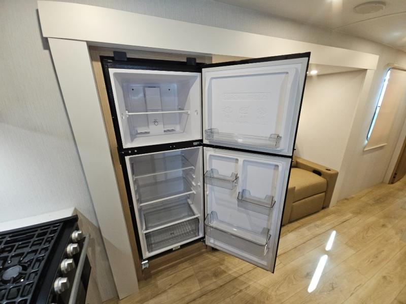 This travel trailer provides both comfort and convenience. At the front, you'll find a private bedroom with its own exterior entry for added privacy and ease of access. The middle bathroom ensures convenient access from all areas and includes a wardrobe with washer and dryer prep. In the main living space, a spacious 42" x 82" Mega Dinette provides a great spot for meals, games, or work, while theater seating across from the TV allows for relaxing evenings. At the rear, the fully equipped kitchen includes a cooktop with oven, a refrigerator, and a pantry with pull-out shelves for maximum storage and organization. A second exterior exit from the kitchen area adds extra convenience, providing both a comfortable and functional trailer.