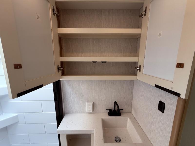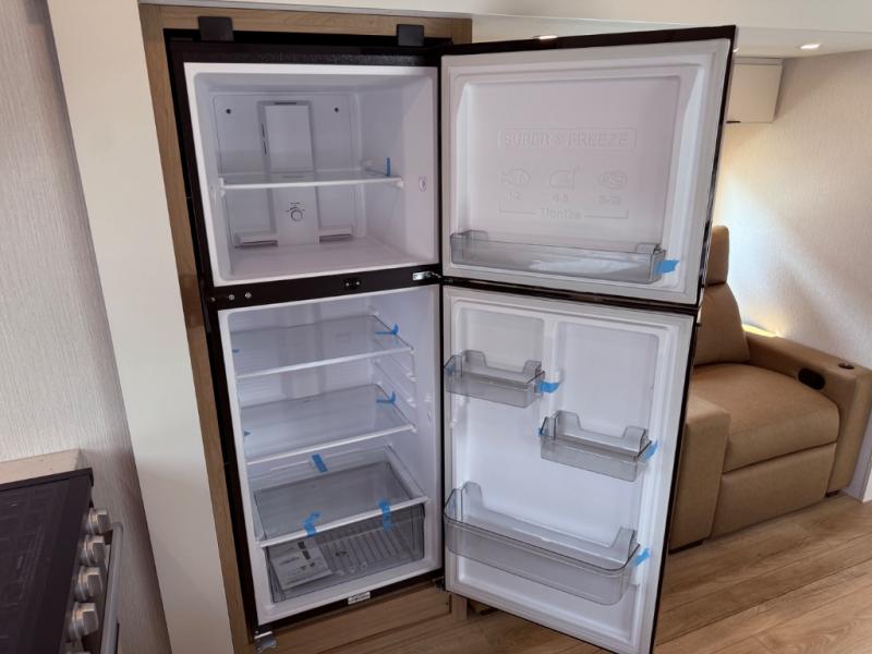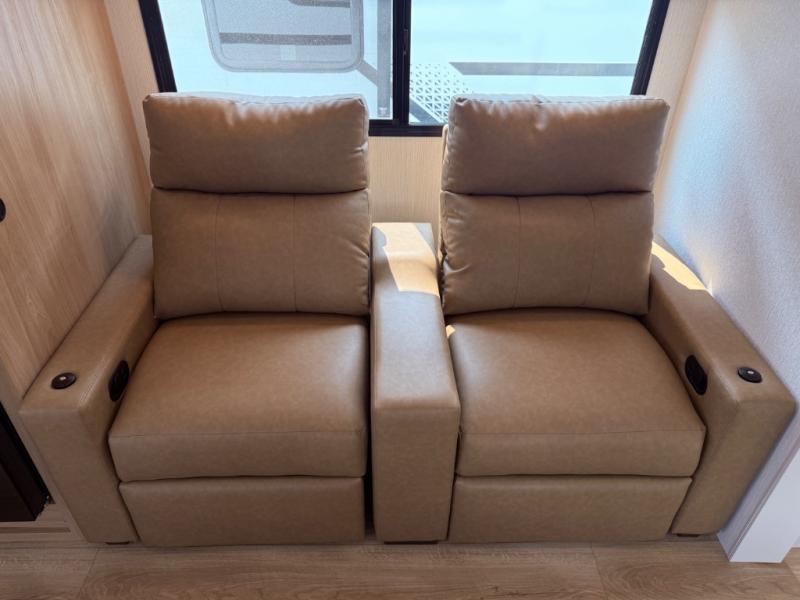 This travel trailer provides both comfort and convenience. At the front, you'll find a private bedroom with its own exterior entry for added privacy and ease of access. The middle bathroom ensures convenient access from all areas and includes a wardrobe with washer and dryer prep. In the main living space, a spacious 42" x 82" Mega Dinette provides a great spot for meals, games, or work, while theater seating across from the TV allows for relaxing evenings. At the rear, the fully equipped kitchen includes a cooktop with oven, a refrigerator, and a pantry with pull-out shelves for maximum storage and organization. A second exterior exit from the kitchen area adds extra convenience, providing both a comfortable and functional trailer.