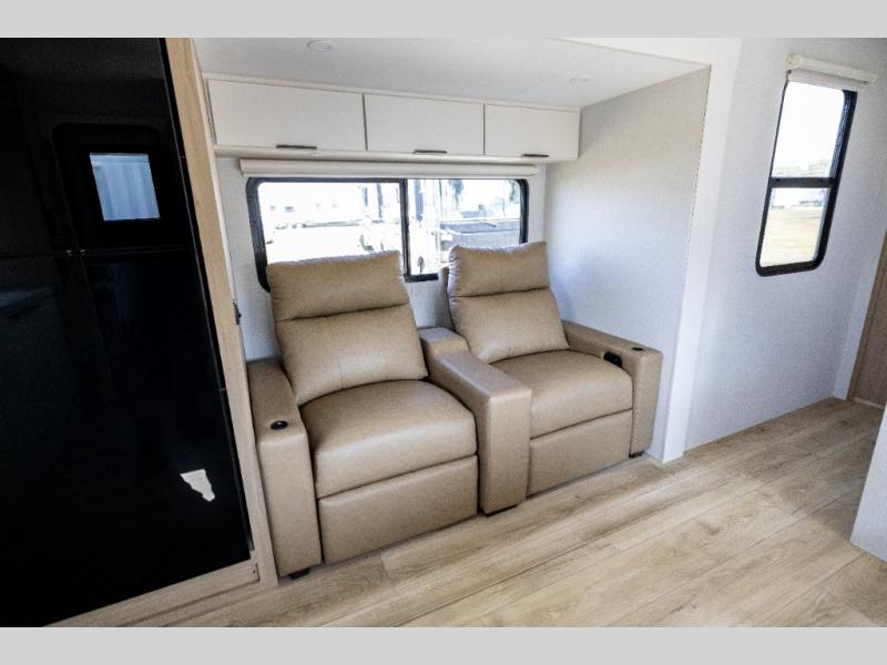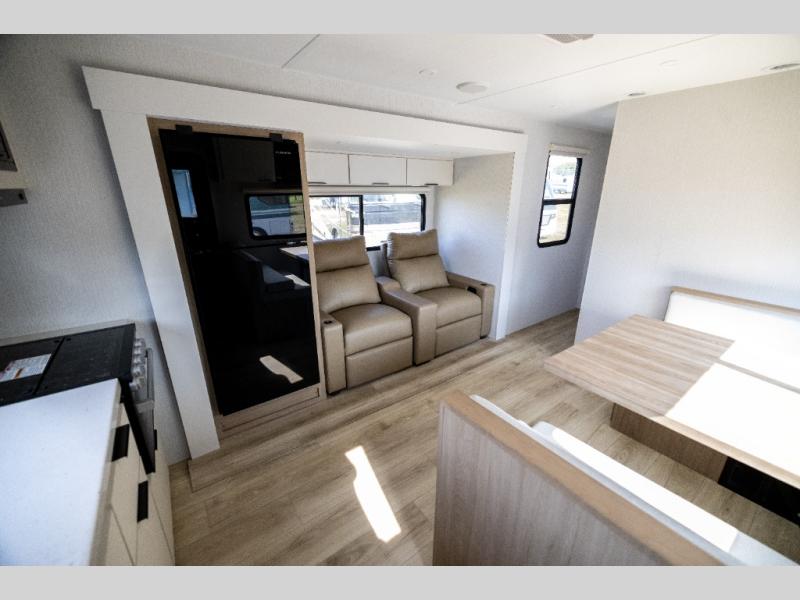 This travel trailer provides both comfort and convenience. At the front, you'll find a private bedroom with its own exterior entry for added privacy and ease of access. The middle bathroom ensures convenient access from all areas and includes a wardrobe with washer and dryer prep. In the main living space, a spacious 42" x 82" Mega Dinette provides a great spot for meals, games, or work, while theater seating across from the TV allows for relaxing evenings. At the rear, the fully equipped kitchen includes a cooktop with oven, a refrigerator, and a pantry with pull-out shelves for maximum storage and organization. A second exterior exit from the kitchen area adds extra convenience, providing both a comfortable and functional trailer.