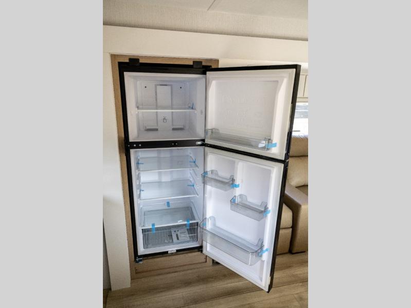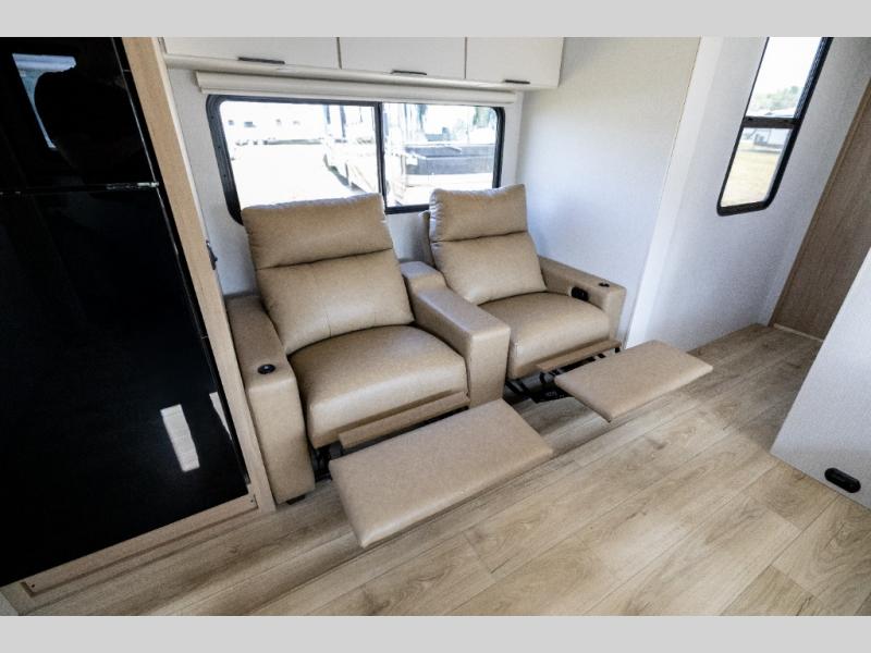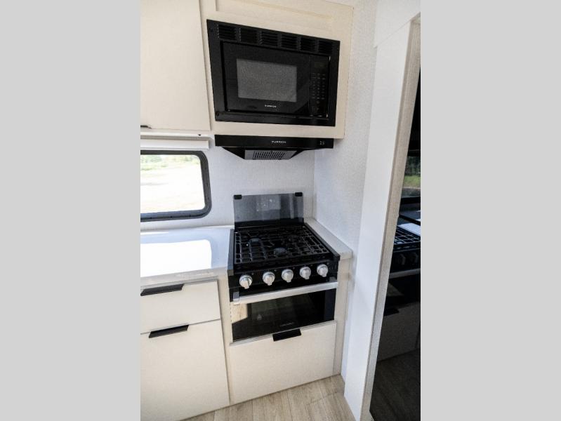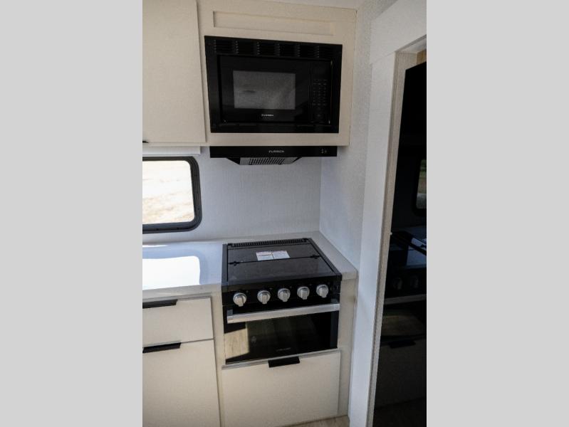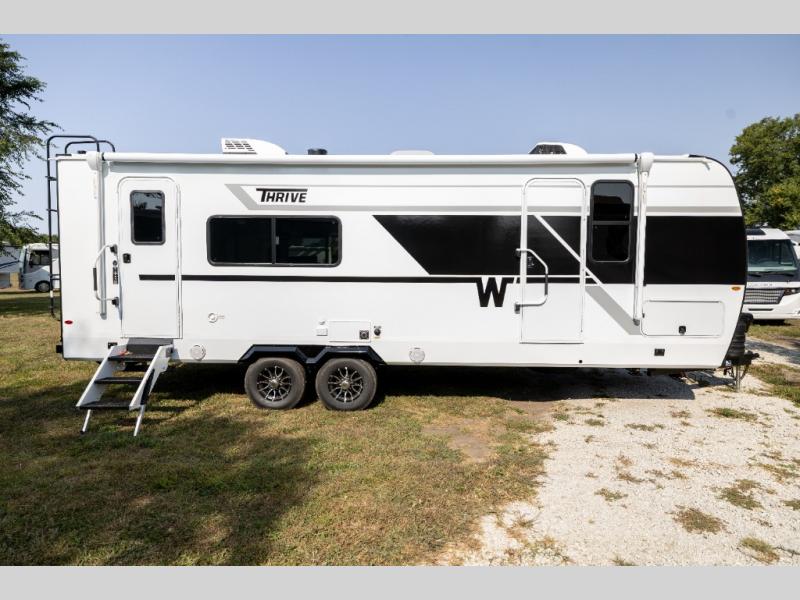 With any Thrive travel trailer by Winnebago, you can camp with functionality, comfort, and convenience! The large front viewing window with strike guard will be the first thing that catches your eye, and the fiberglass sidewalls with Azdel Onboard provide a durable trailer made to last. There is also an exterior ladder, along with front radius profile lights, power stabilizer jacks, and a powered awning with LED lighting to name a few exterior features. You will stay powered up by the 30-amp power cord and 200-watt solar panel, plus there is a tankless water heater for endless hot showers. Inside, you'll love the custom Winnebago furniture, carpetless side outs, molded fiberglass countertops, and residential recessed ceiling lights to keep your space well lit!