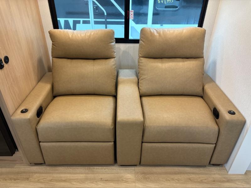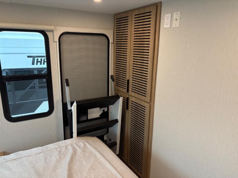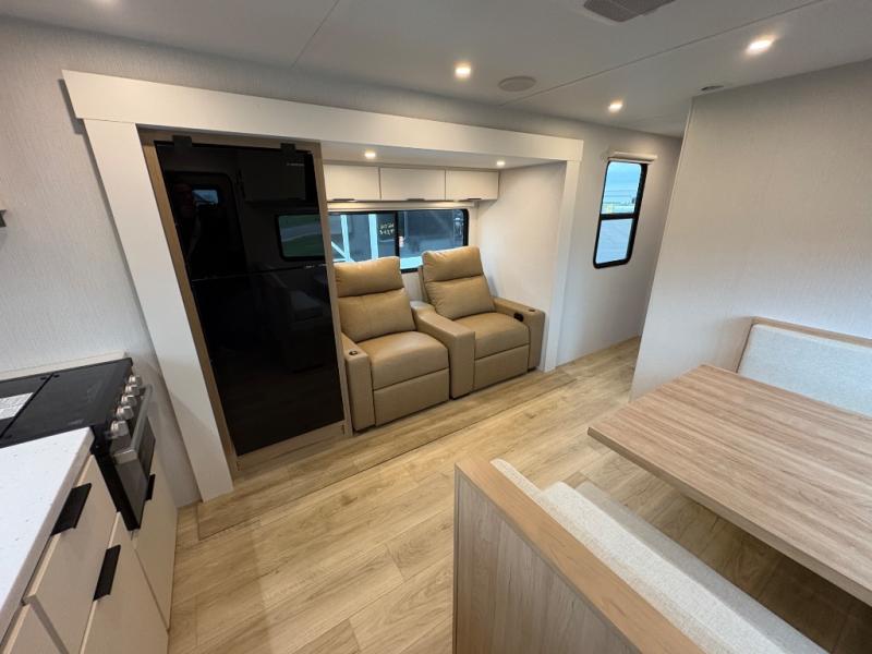 This travel trailer provides both comfort and convenience. At the front, you'll find a private bedroom with its own exterior entry for added privacy and ease of access. The middle bathroom ensures convenient access from all areas and includes a wardrobe with washer and dryer prep. In the main living space, a spacious 42" x 82" Mega Dinette provides a great spot for meals, games, or work, while theater seating across from the TV allows for relaxing evenings. At the rear, the fully equipped kitchen includes a cooktop with oven, a refrigerator, and a pantry with pull-out shelves for maximum storage and organization. A second exterior exit from the kitchen area adds extra convenience, providing both a comfortable and functional trailer.