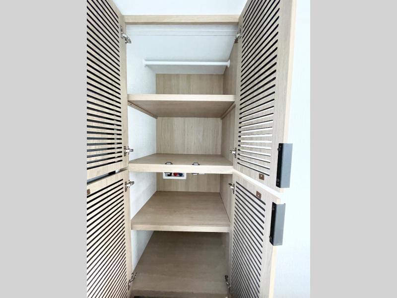 This travel trailer provides both comfort and convenience. At the front, you'll find a private bedroom with its own exterior entry for added privacy and ease of access. The middle bathroom ensures convenient access from all areas and includes a wardrobe with washer and dryer prep. In the main living space, a spacious 42" x 82" Mega Dinette provides a great spot for meals, games, or work, while theater seating across from the TV allows for relaxing evenings. At the rear, the fully equipped kitchen includes a cooktop with oven, a refrigerator, and a pantry with pull-out shelves for maximum storage and organization. A second exterior exit from the kitchen area adds extra convenience, providing both a comfortable and functional trailer.