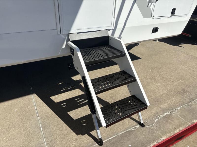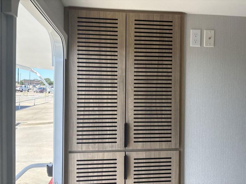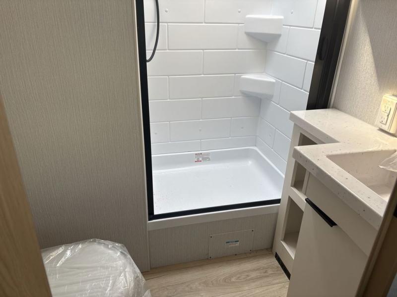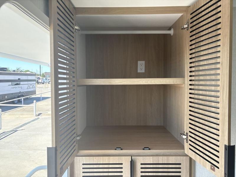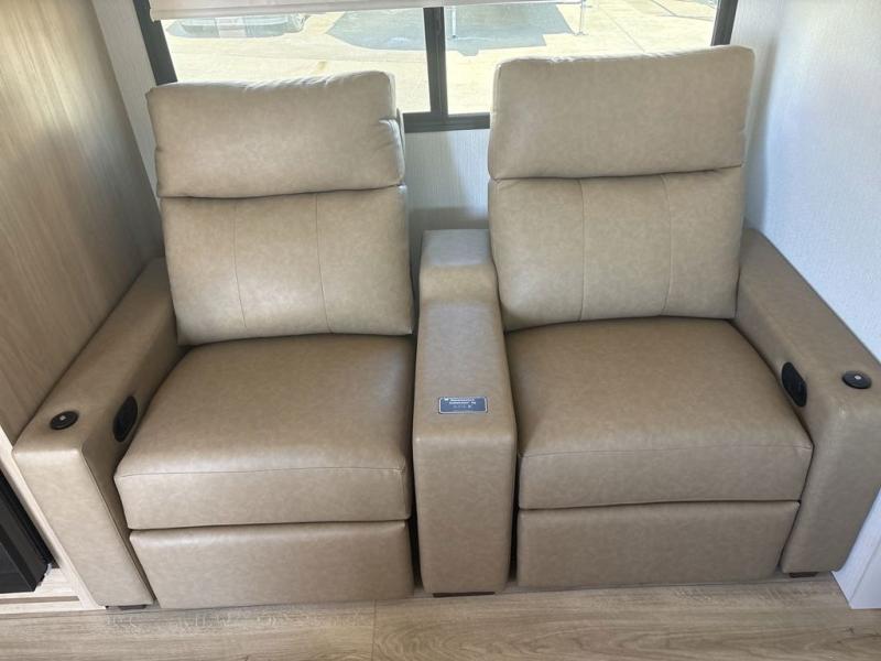 This travel trailer provides both comfort and convenience. At the front, you'll find a private bedroom with its own exterior entry for added privacy and ease of access. The middle bathroom ensures convenient access from all areas and includes a wardrobe with washer and dryer prep. In the main living space, a spacious 42" x 82" Mega Dinette provides a great spot for meals, games, or work, while theater seating across from the TV allows for relaxing evenings. At the rear, the fully equipped kitchen includes a cooktop with oven, a refrigerator, and a pantry with pull-out shelves for maximum storage and organization. A second exterior exit from the kitchen area adds extra convenience, providing both a comfortable and functional trailer.