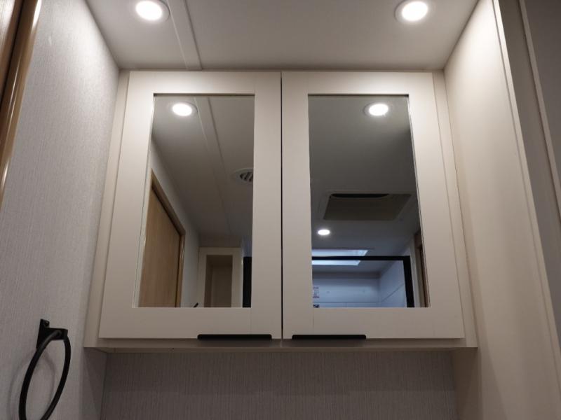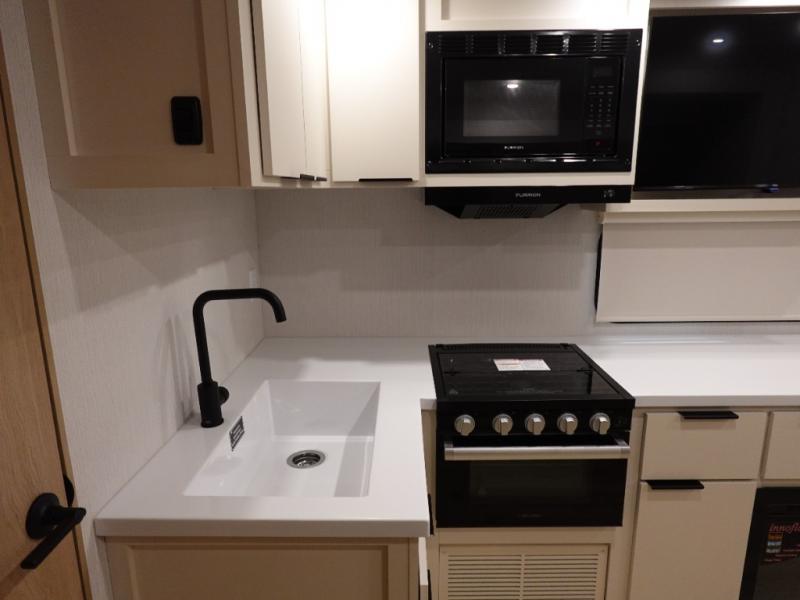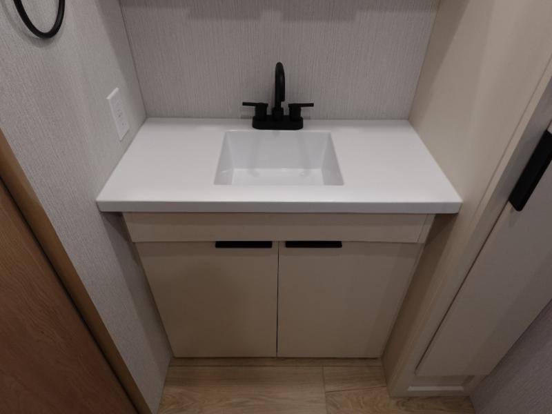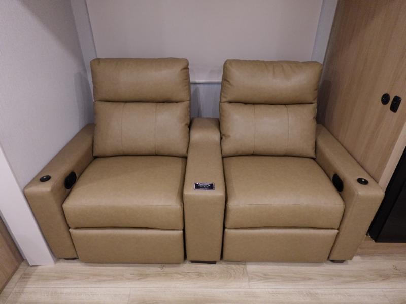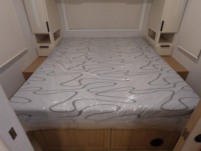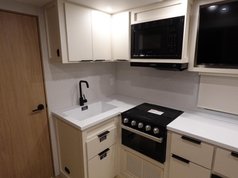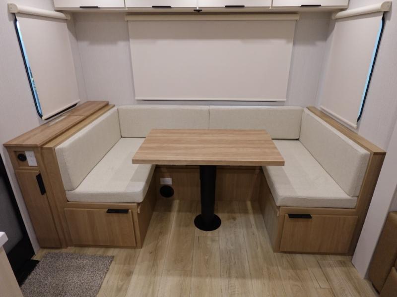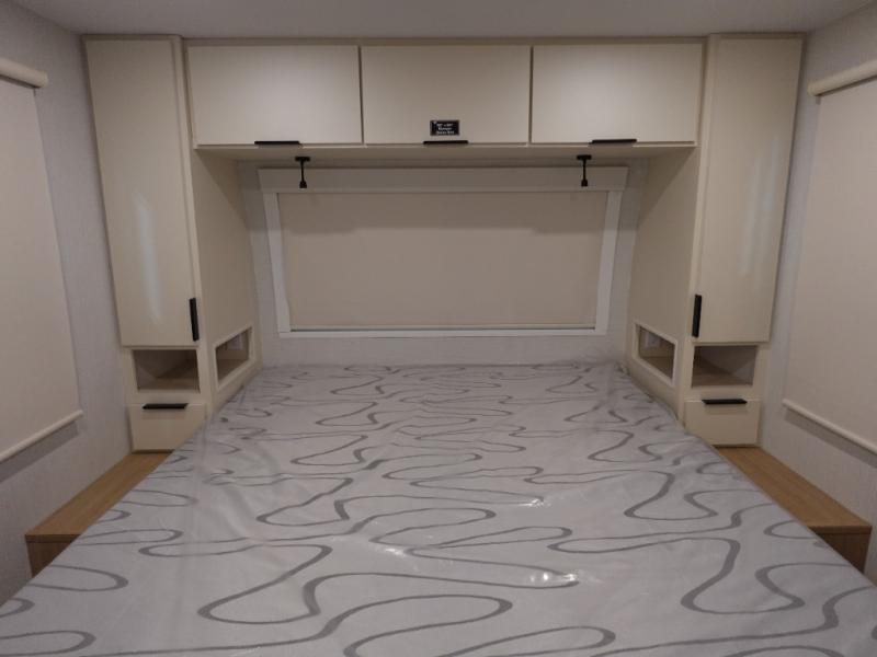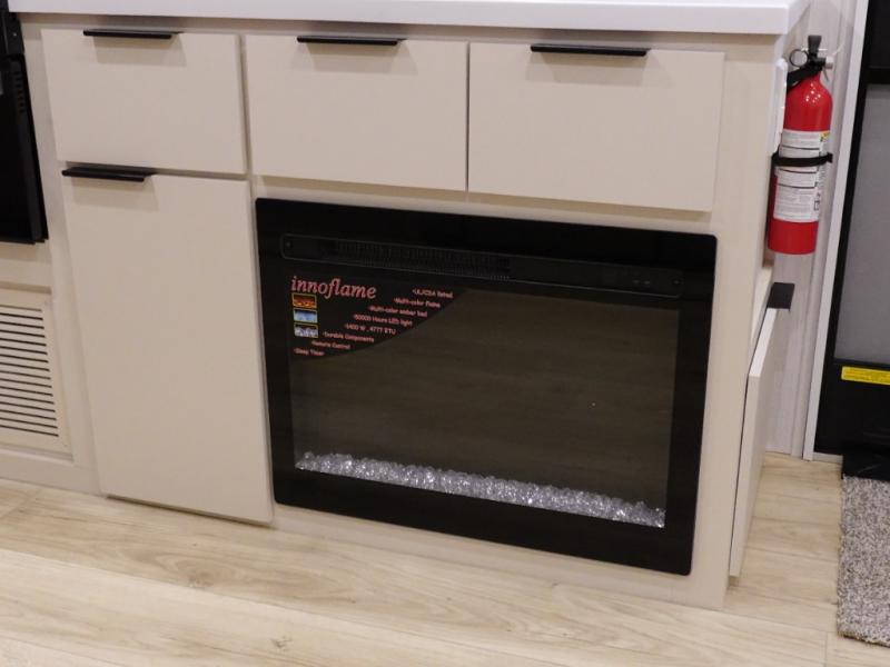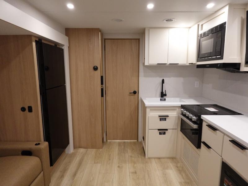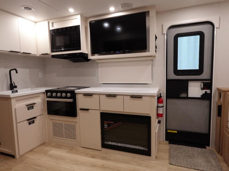 The rear living space of this travel trailer offers a spacious and welcoming layout, perfect for relaxing or entertaining after a day of adventure. In the main area three is a large 42" x 86" U-shaped dinette, with plenty of room for meals, games or gathering to share stories. Beside there is theater seating located in the slide-out that adds extra comfort and seating space. Across, a cozy fireplace and TV making this the ideal spot for winding down in the evenings. The kitchen and appliances allow the chef to easily move around in the spacious living area. Moving forward, a pass-through bathroom adds convenience and privacy, leading to the front private bedroom. Here you'll find a spacious 66" x 80" Olympic Queen Bed, on each side wardrobes for ample storage. The bedroom also features a second exterior entry door, providing easy access without disturbing the main living area.