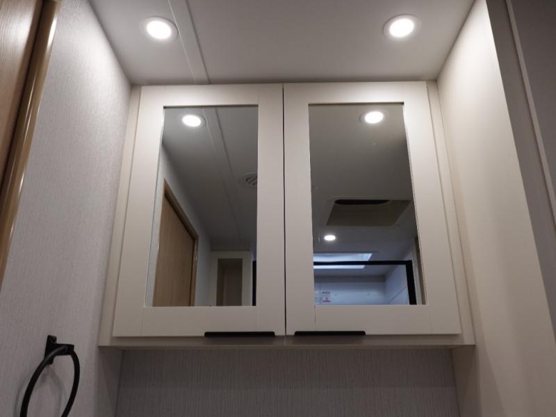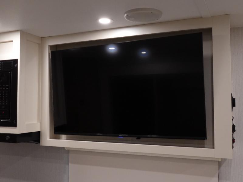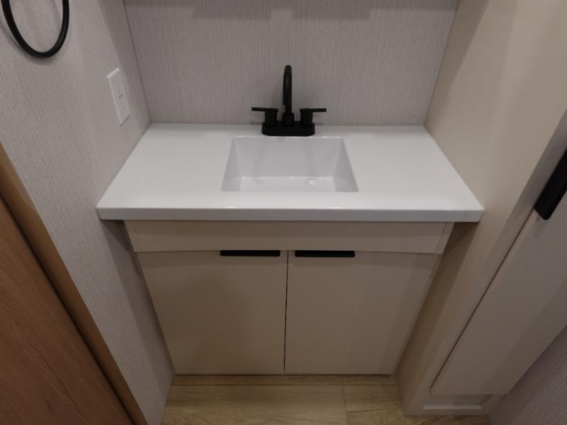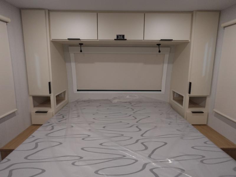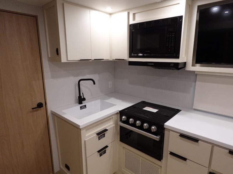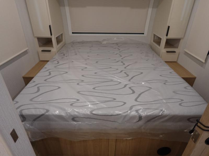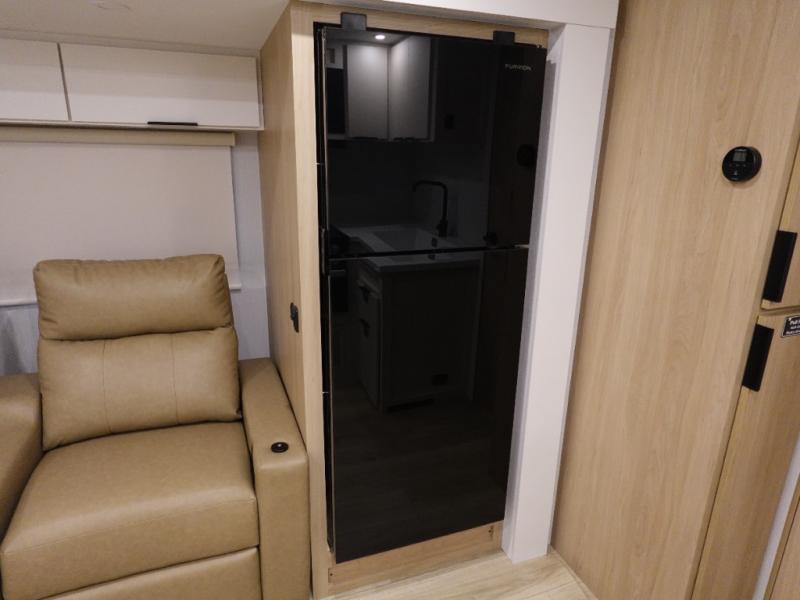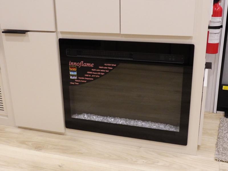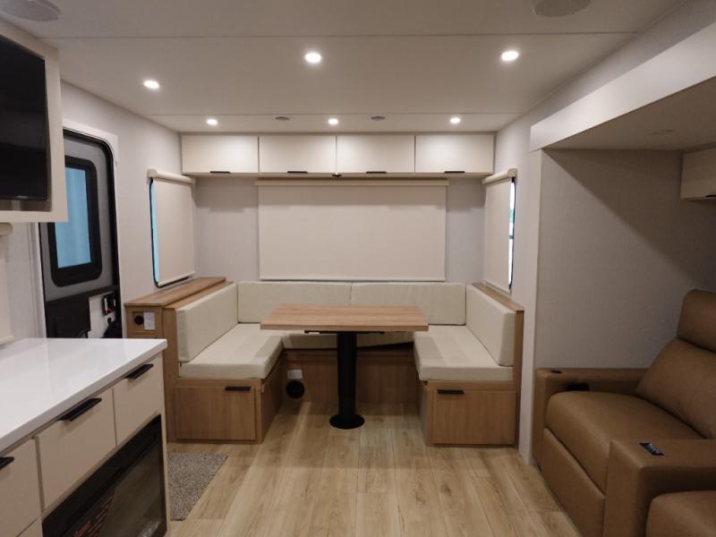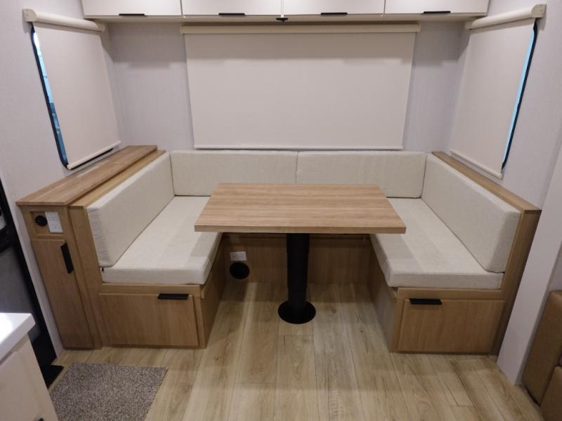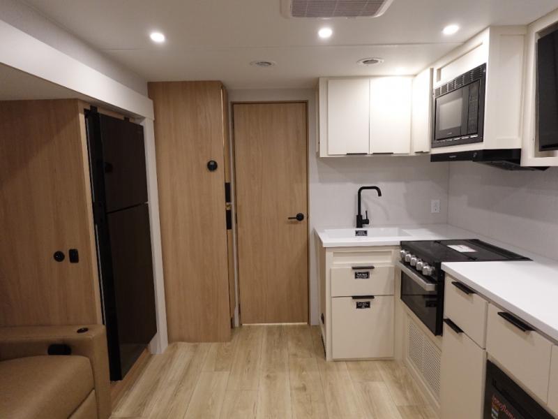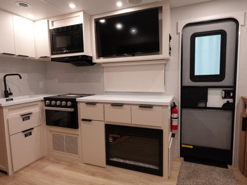 The rear living space of this travel trailer offers a spacious and welcoming layout, perfect for relaxing or entertaining after a day of adventure. In the main area three is a large 42" x 86" U-shaped dinette, with plenty of room for meals, games or gathering to share stories. Beside there is theater seating located in the slide-out that adds extra comfort and seating space. Across, a cozy fireplace and TV making this the ideal spot for winding down in the evenings. The kitchen and appliances allow the chef to easily move around in the spacious living area. Moving forward, a pass-through bathroom adds convenience and privacy, leading to the front private bedroom. Here you'll find a spacious 66" x 80" Olympic Queen Bed, on each side wardrobes for ample storage. The bedroom also features a second exterior entry door, providing easy access without disturbing the main living area.