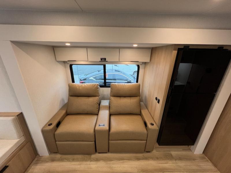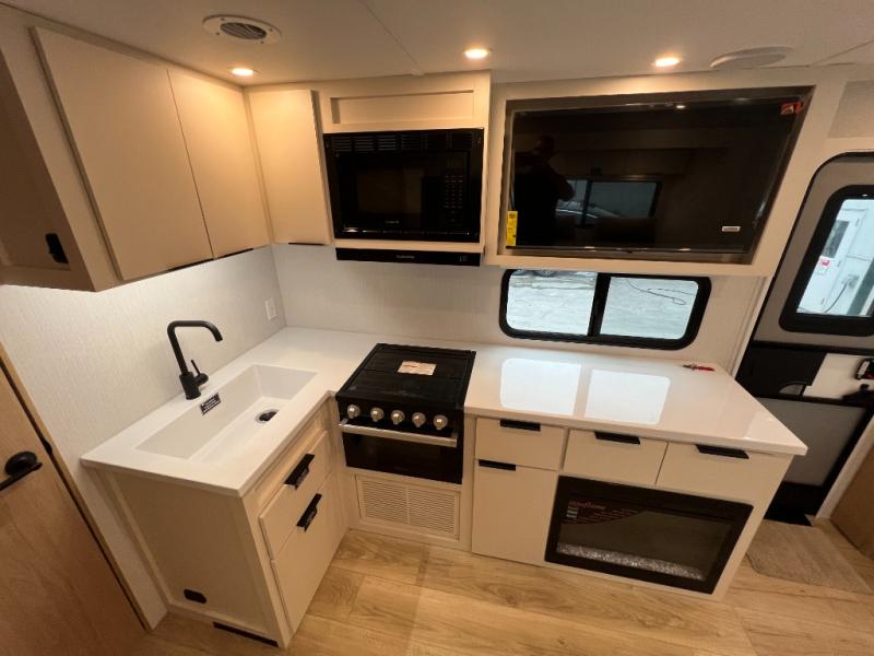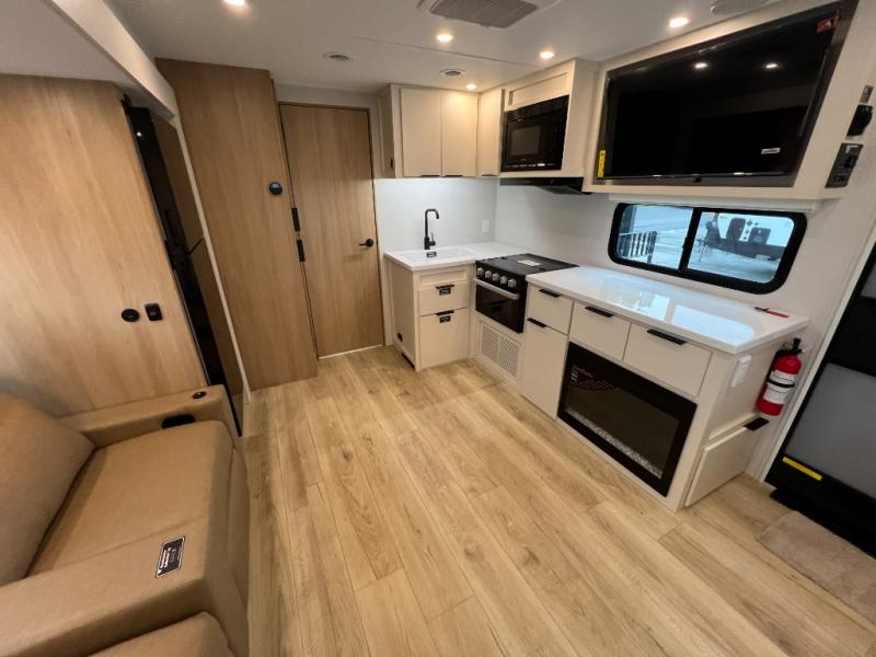 The rear living space of this travel trailer offers a spacious and welcoming layout, perfect for relaxing or entertaining after a day of adventure. In the main area three is a large 42" x 86" U-shaped dinette, with plenty of room for meals, games or gathering to share stories. Beside there is theater seating located in the slide-out that adds extra comfort and seating space. Across, a cozy fireplace and TV making this the ideal spot for winding down in the evenings. The kitchen and appliances allow the chef to easily move around in the spacious living area. Moving forward, a pass-through bathroom adds convenience and privacy, leading to the front private bedroom. Here you'll find a spacious 66" x 80" Olympic Queen Bed, on each side wardrobes for ample storage. The bedroom also features a second exterior entry door, providing easy access without disturbing the main living area.