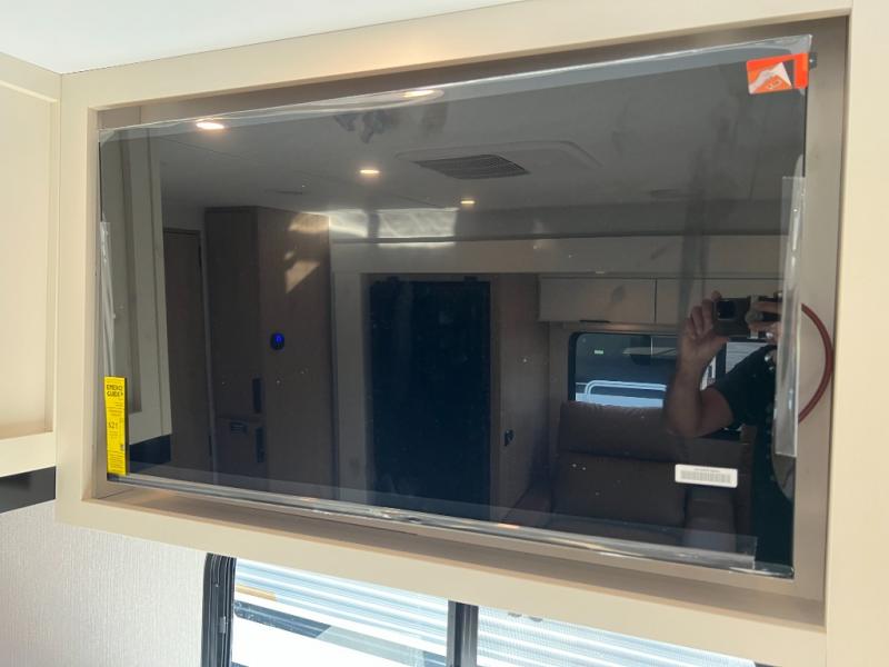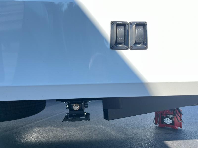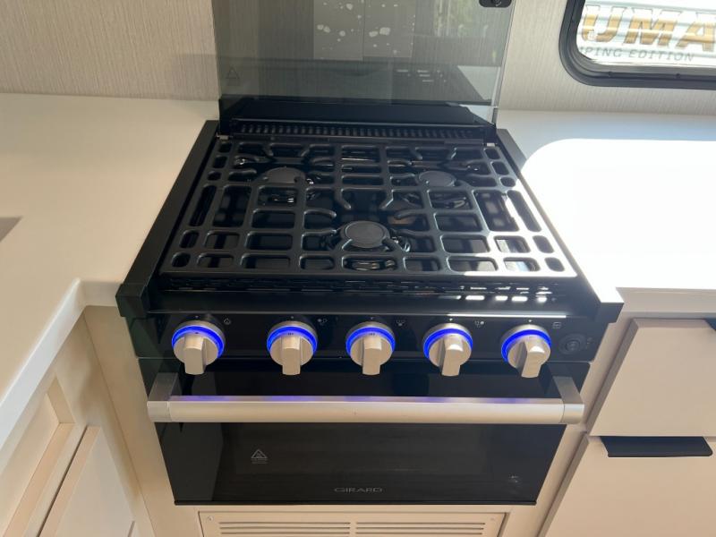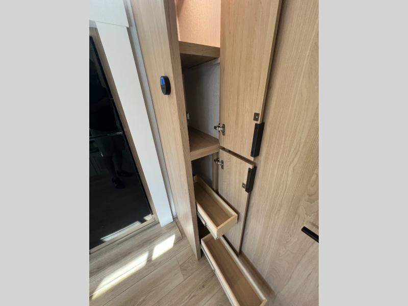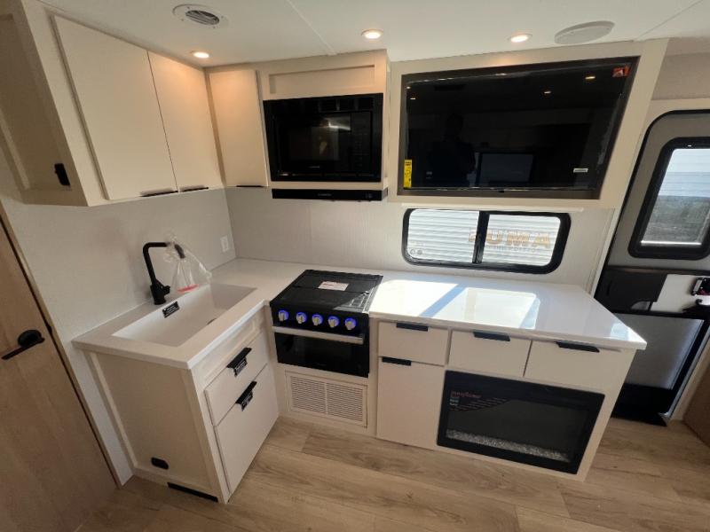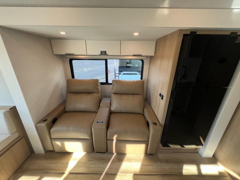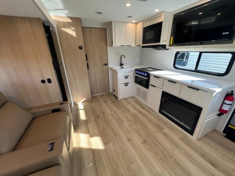 The rear living space of this travel trailer offers a spacious and welcoming layout, perfect for relaxing or entertaining after a day of adventure. In the main area three is a large 42" x 86" U-shaped dinette, with plenty of room for meals, games or gathering to share stories. Beside there is theater seating located in the slide-out that adds extra comfort and seating space. Across, a cozy fireplace and TV making this the ideal spot for winding down in the evenings. The kitchen and appliances allow the chef to easily move around in the spacious living area. Moving forward, a pass-through bathroom adds convenience and privacy, leading to the front private bedroom. Here you'll find a spacious 66" x 80" Olympic Queen Bed, on each side wardrobes for ample storage. The bedroom also features a second exterior entry door, providing easy access without disturbing the main living area.