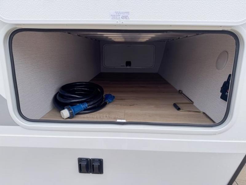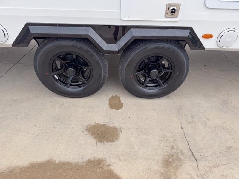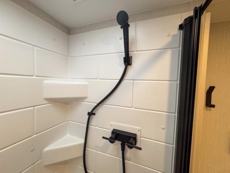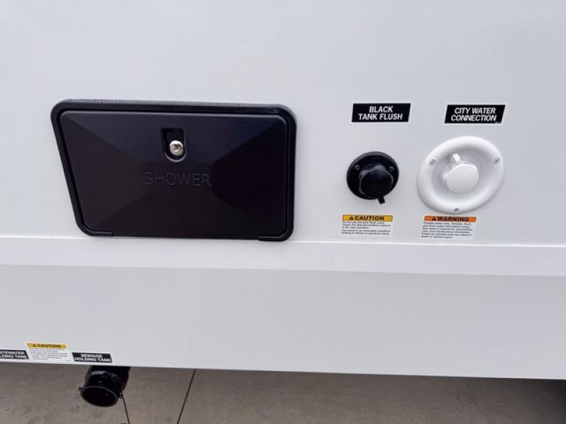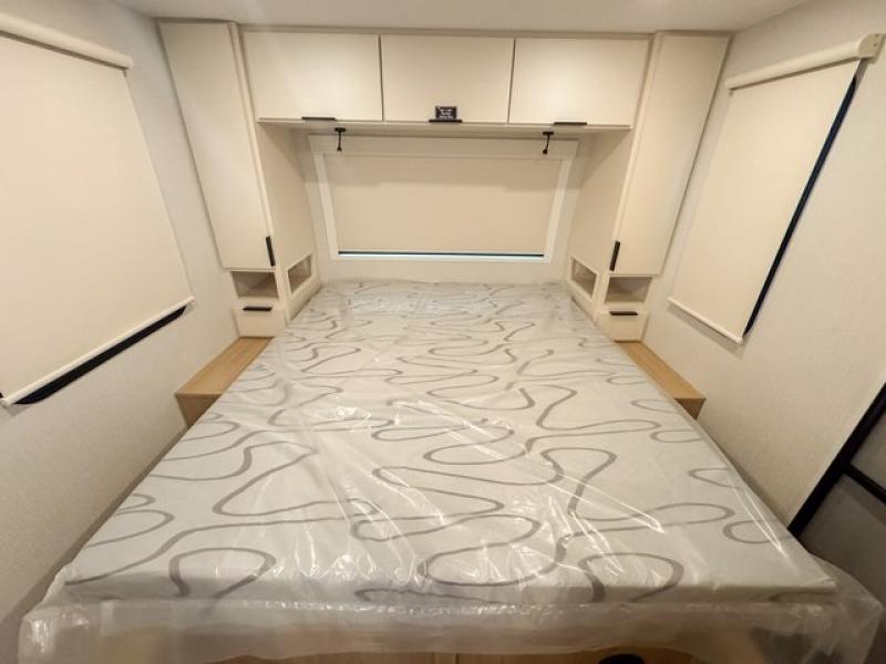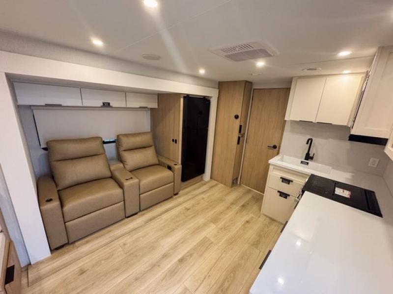 The rear living space of this travel trailer offers a spacious and welcoming layout, perfect for relaxing or entertaining after a day of adventure. In the main area three is a large 42" x 86" U-shaped dinette, with plenty of room for meals, games or gathering to share stories. Beside there is theater seating located in the slide-out that adds extra comfort and seating space. Across, a cozy fireplace and TV making this the ideal spot for winding down in the evenings. The kitchen and appliances allow the chef to easily move around in the spacious living area. Moving forward, a pass-through bathroom adds convenience and privacy, leading to the front private bedroom. Here you'll find a spacious 66" x 80" Olympic Queen Bed, on each side wardrobes for ample storage. The bedroom also features a second exterior entry door, providing easy access without disturbing the main living area.