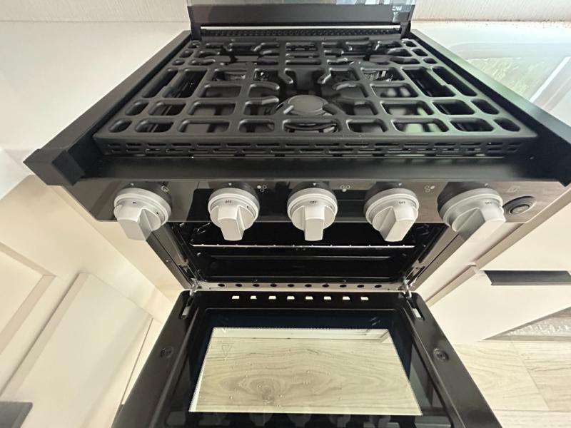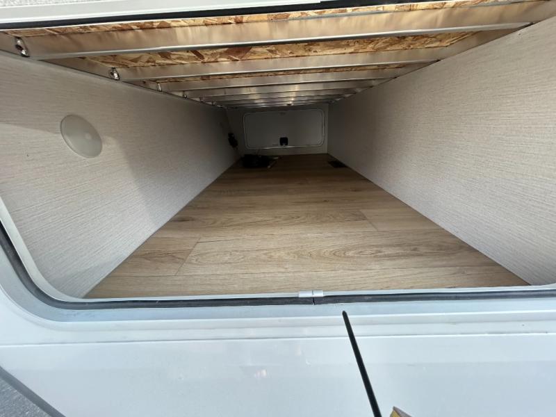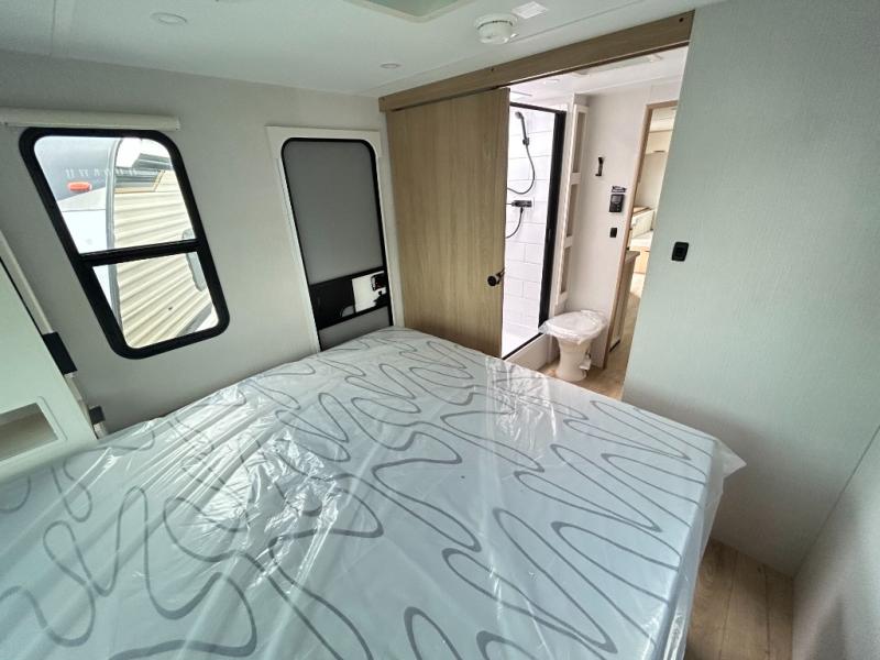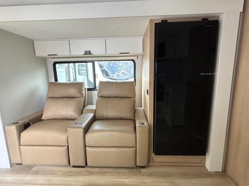 The rear living space of this travel trailer offers a spacious and welcoming layout, perfect for relaxing or entertaining after a day of adventure. In the main area three is a large 42" x 86" U-shaped dinette, with plenty of room for meals, games or gathering to share stories. Beside there is theater seating located in the slide-out that adds extra comfort and seating space. Across, a cozy fireplace and TV making this the ideal spot for winding down in the evenings. The kitchen and appliances allow the chef to easily move around in the spacious living area. Moving forward, a pass-through bathroom adds convenience and privacy, leading to the front private bedroom. Here you'll find a spacious 66" x 80" Olympic Queen Bed, on each side wardrobes for ample storage. The bedroom also features a second exterior entry door, providing easy access without disturbing the main living area.