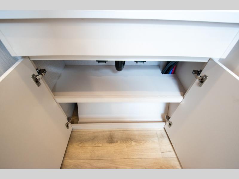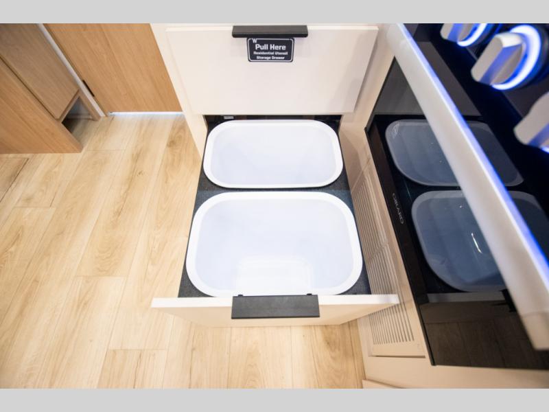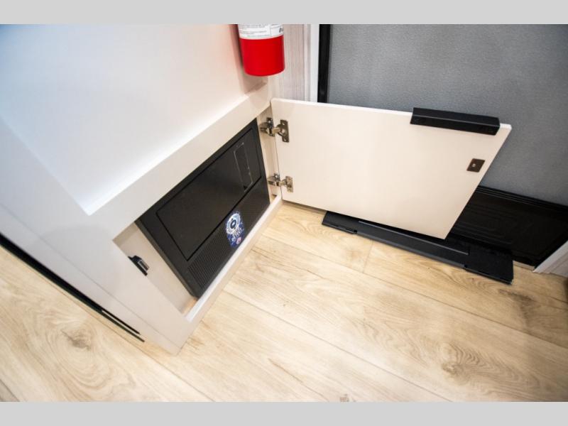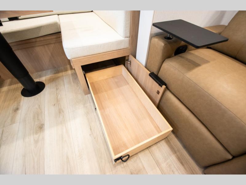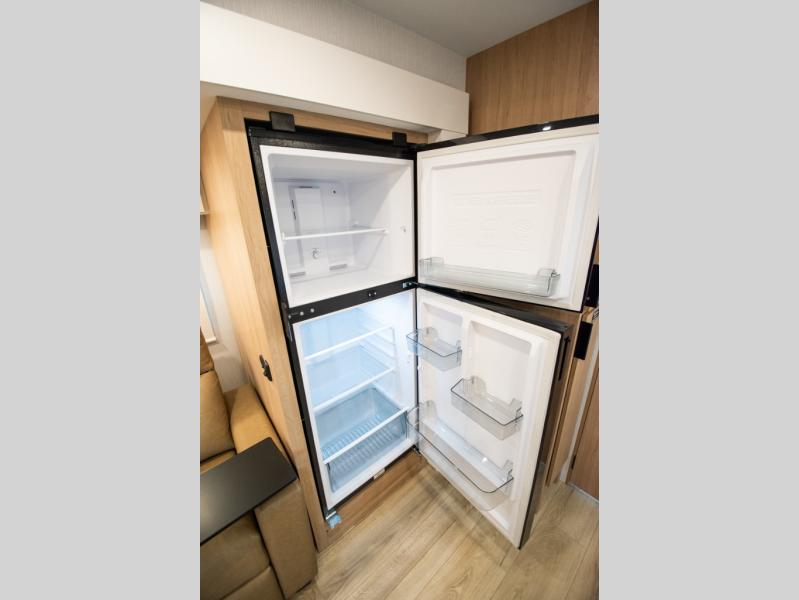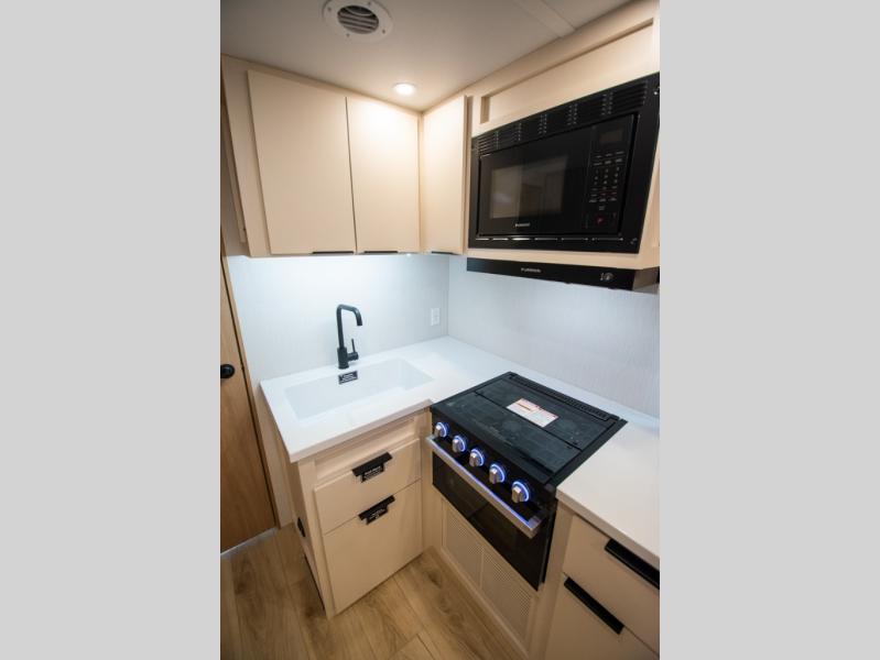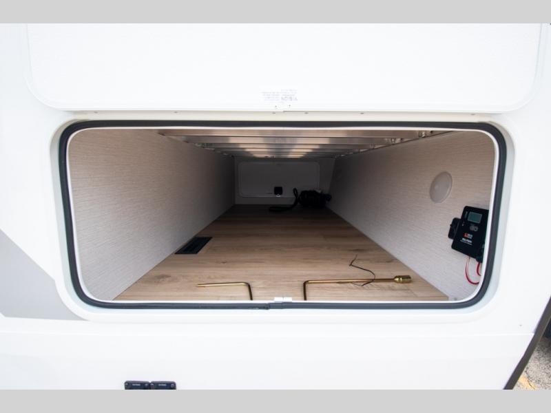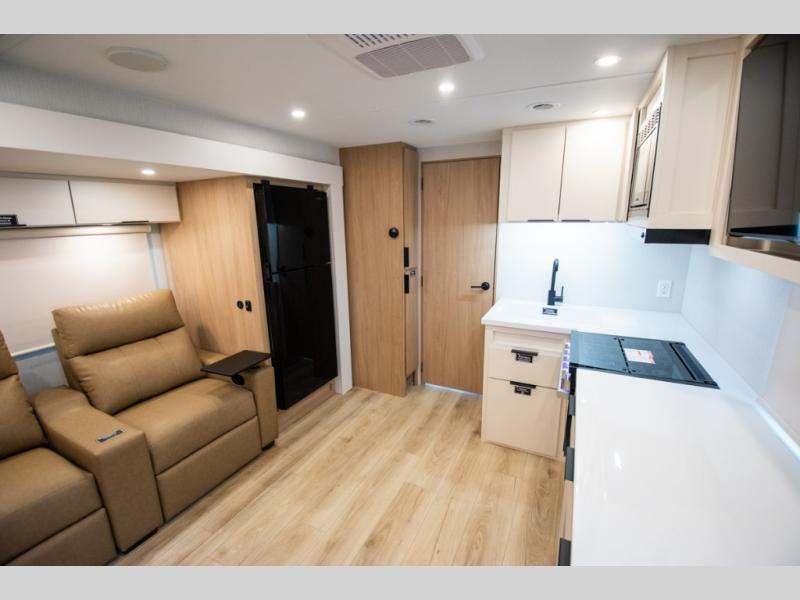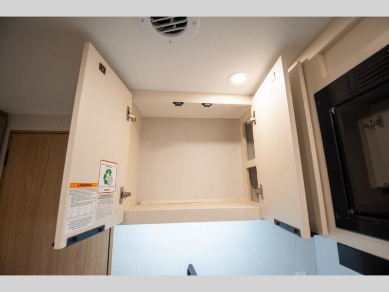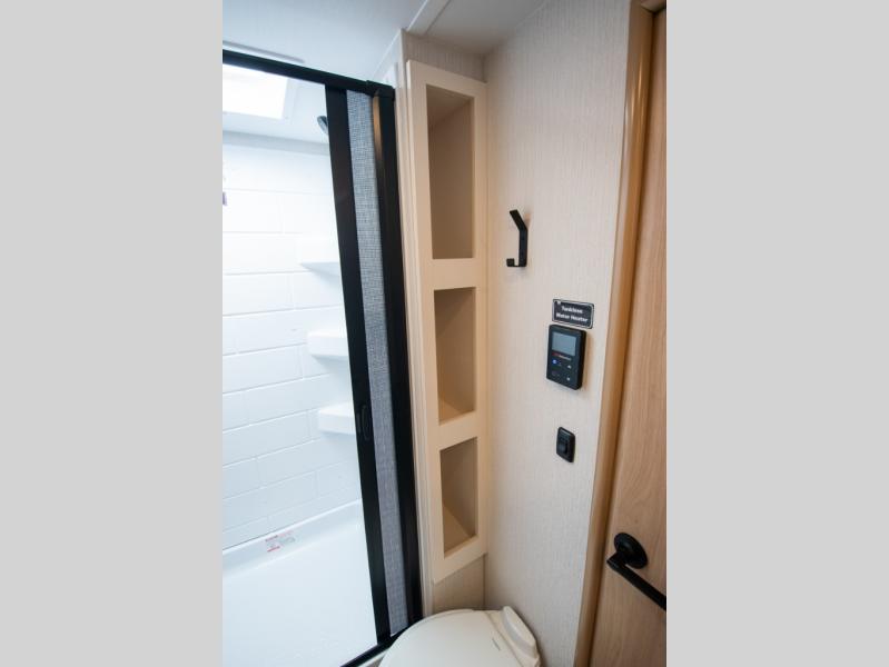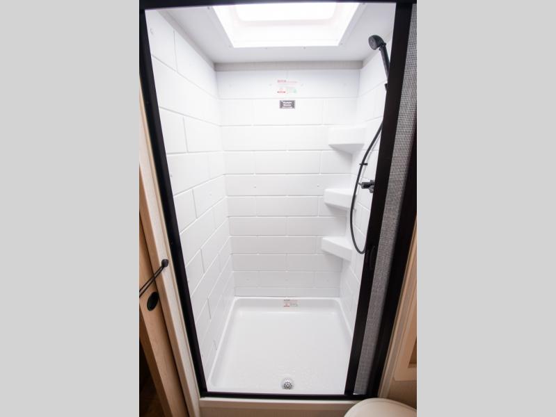 With any Thrive travel trailer by Winnebago, you can camp with functionality, comfort, and convenience! The large front viewing window with strike guard will be the first thing that catches your eye, and the fiberglass sidewalls with Azdel Onboard provide a durable trailer made to last. There is also an exterior ladder, along with front radius profile lights, power stabilizer jacks, and a powered awning with LED lighting to name a few exterior features. You will stay powered up by the 30-amp power cord and 200-watt solar panel, plus there is a tankless water heater for endless hot showers. Inside, you'll love the custom Winnebago furniture, carpetless side outs, molded fiberglass countertops, and residential recessed ceiling lights to keep your space well lit!