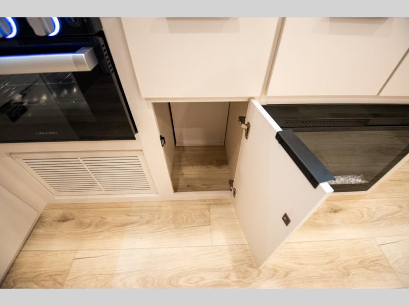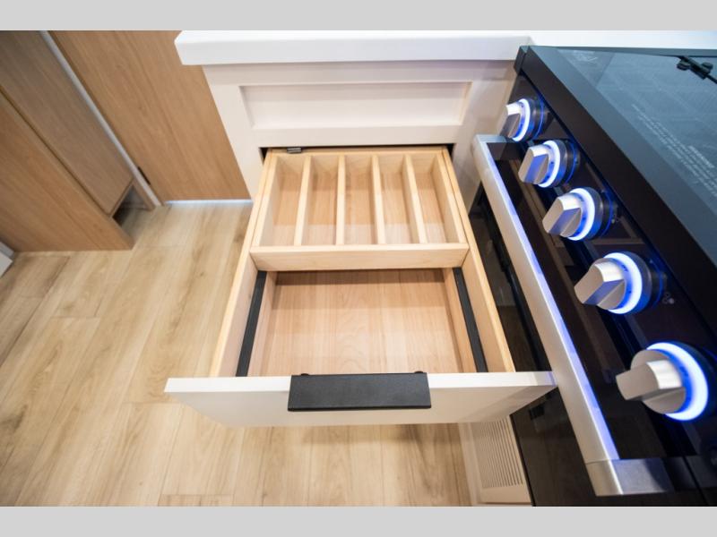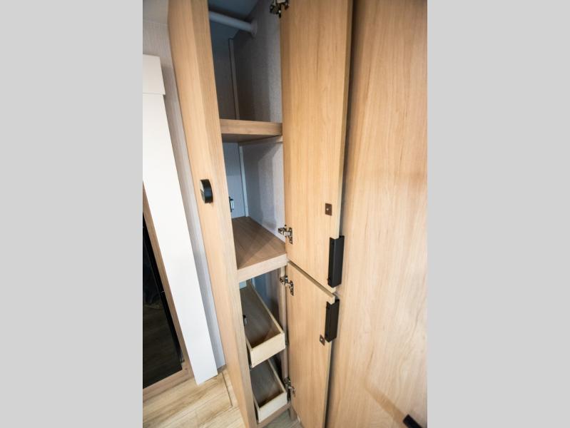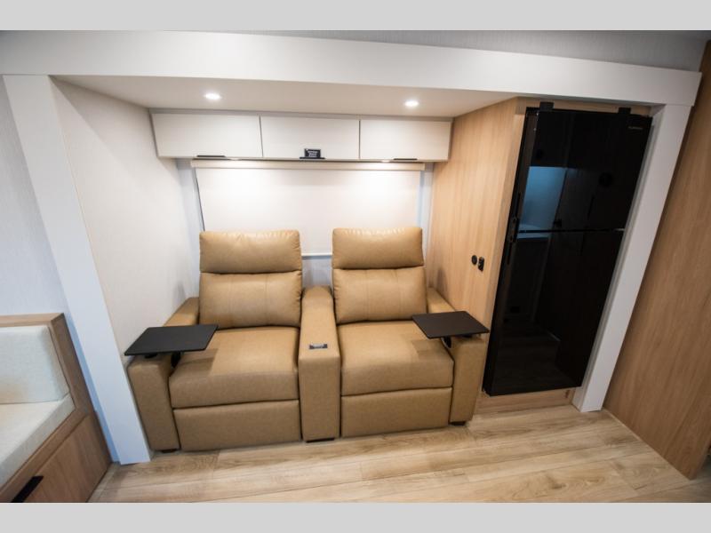 The rear living space of this travel trailer offers a spacious and welcoming layout, perfect for relaxing or entertaining after a day of adventure. In the main area there is a large 42" x 86" U-shaped dinette with plenty of room for meals, games or gathering to share stories. Beside there is theater seating located in the slide-out that adds extra comfort and seating space. Across, a cozy fireplace and TV making this the ideal spot for winding down in the evenings. The kitchen and appliances allow the chef to easily move around in the spacious living area. Moving forward, a pass-through bathroom adds convenience and privacy, leading to the front private bedroom. Here you'll find a spacious 66" x 80" Olympic Queen Bed, on each side wardrobes for ample storage. The bedroom also features a second exterior entry door, providing easy access without disturbing the main living area.