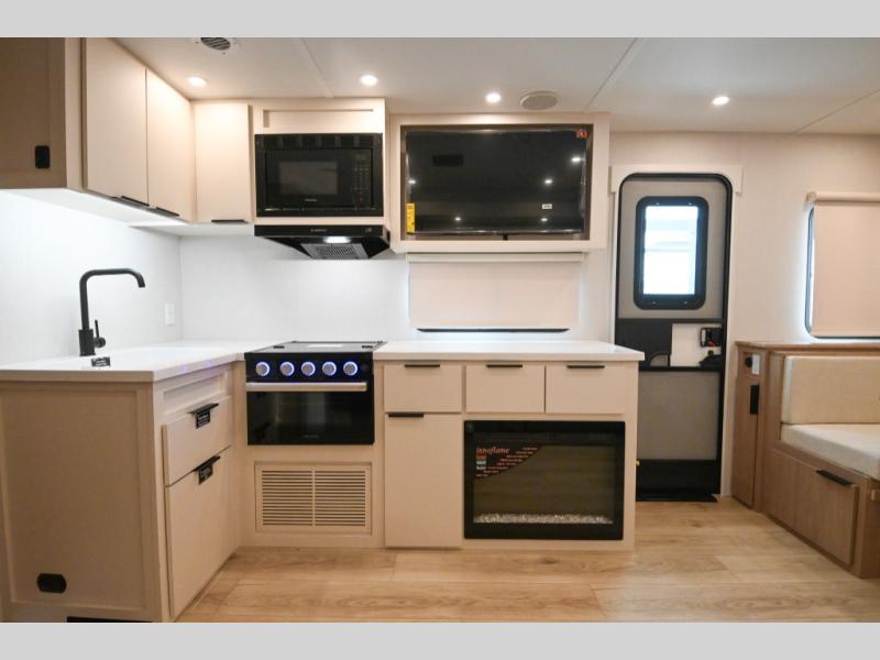 The rear living space of this travel trailer offers a spacious and welcoming layout, perfect for relaxing or entertaining after a day of adventure. In the main area there is a large 42" x 86" U-shaped dinette with plenty of room for meals, games or gathering to share stories. Beside there is theater seating located in the slide-out that adds extra comfort and seating space. Across, a cozy fireplace and TV making this the ideal spot for winding down in the evenings. The kitchen and appliances allow the chef to easily move around in the spacious living area. Moving forward, a pass-through bathroom adds convenience and privacy, leading to the front private bedroom. Here you'll find a spacious 66" x 80" Olympic Queen Bed, on each side wardrobes for ample storage. The bedroom also features a second exterior entry door, providing easy access without disturbing the main living area.