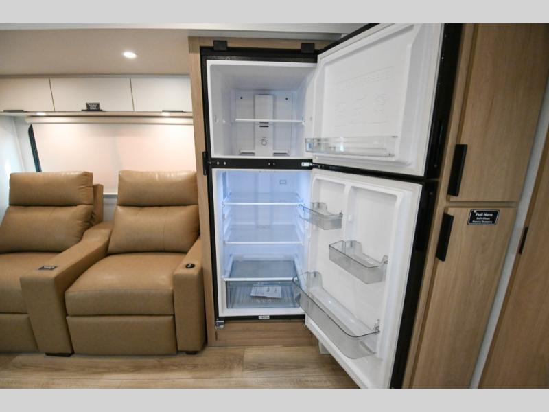 With any Thrive travel trailer by Winnebago, you can camp with functionality, comfort, and convenience! The large front viewing window with strike guard will be the first thing that catches your eye, and the fiberglass sidewalls with Azdel Onboard provide a durable trailer made to last. There is also an exterior ladder, along with front radius profile lights, power stabilizer jacks, and a powered awning with LED lighting to name a few exterior features. You will stay powered up by the 30-amp power cord and 200-watt solar panel, plus there is a tankless water heater for endless hot showers. Inside, you'll love the custom Winnebago furniture, carpetless side outs, molded fiberglass countertops, and residential recessed ceiling lights to keep your space well lit!