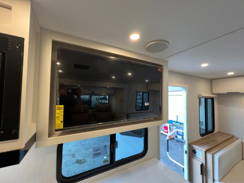With any Thrive travel trailer by Winnebago, you can camp with functionality, comfort, and convenience! The large front viewing window with strike guard will be the first thing that catches your eye, and the fiberglass sidewalls with Azdel Onboard provide a durable trailer made to last. There is also an exterior ladder, along with front radius profile lights, power stabilizer jacks, and a powered awning with LED lighting to name a few exterior features. You will stay powered up by the 30-amp power cord and 200-watt solar panel, plus there is a tankless water heater for endless hot showers. Inside, you'll love the custom Winnebago furniture, carpetless side outs, molded fiberglass countertops, and residential recessed ceiling lights to keep your space well lit!