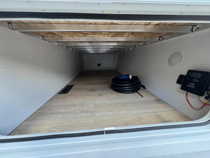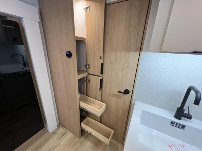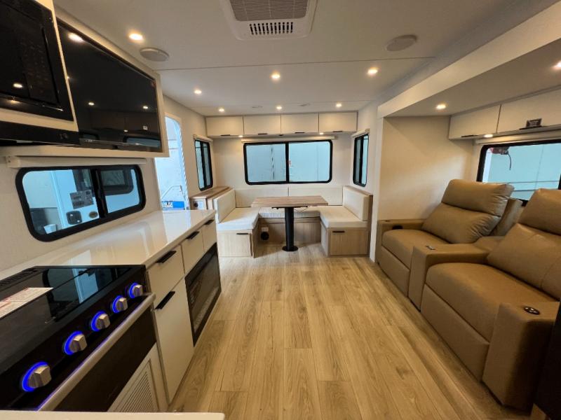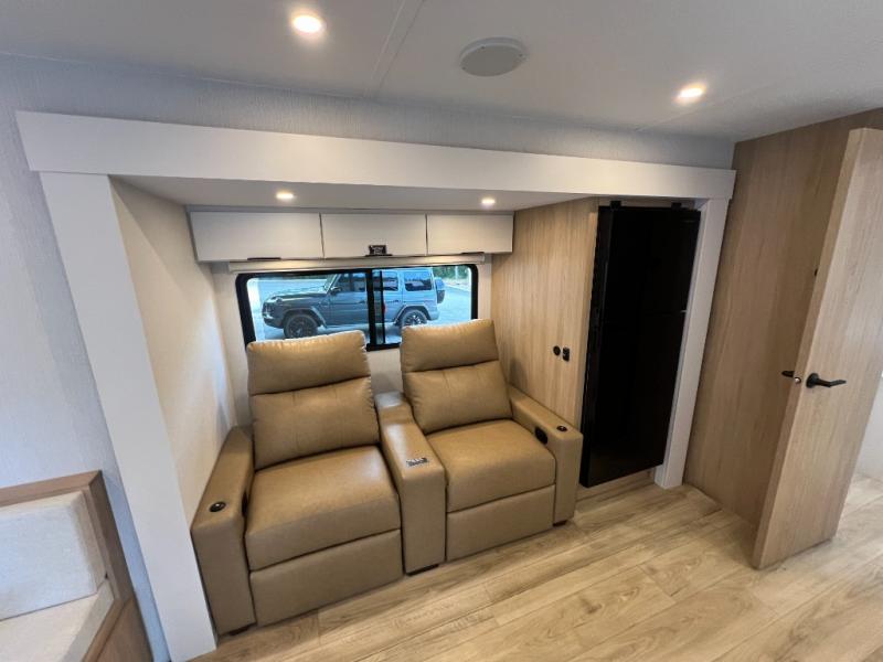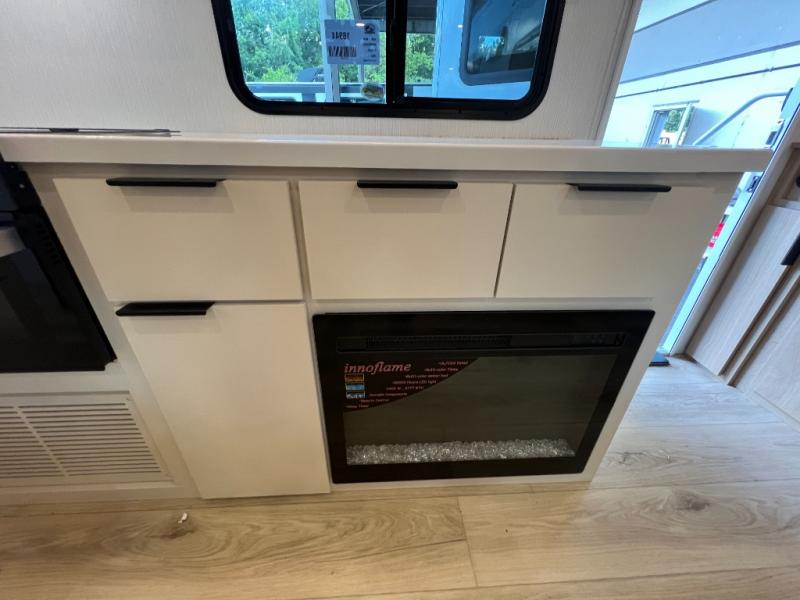 The rear living space of this travel trailer offers a spacious and welcoming layout, perfect for relaxing or entertaining after a day of adventure. In the main area three is a large 42" x 86" U-shaped dinette, with plenty of room for meals, games or gathering to share stories. Beside there is theater seating located in the slide-out that adds extra comfort and seating space. Across, a cozy fireplace and TV making this the ideal spot for winding down in the evenings. The kitchen and appliances allow the chef to easily move around in the spacious living area. Moving forward, a pass-through bathroom adds convenience and privacy, leading to the front private bedroom. Here you'll find a spacious 66" x 80" Olympic Queen Bed, on each side wardrobes for ample storage. The bedroom also features a second exterior entry door, providing easy access without disturbing the main living area.