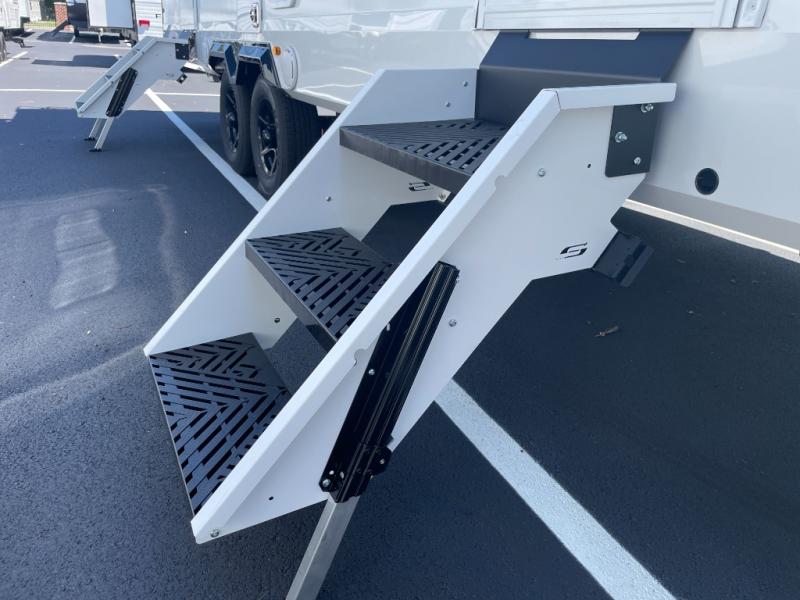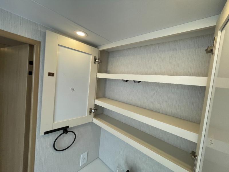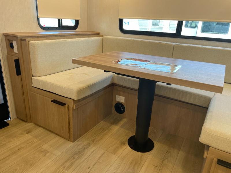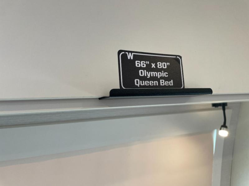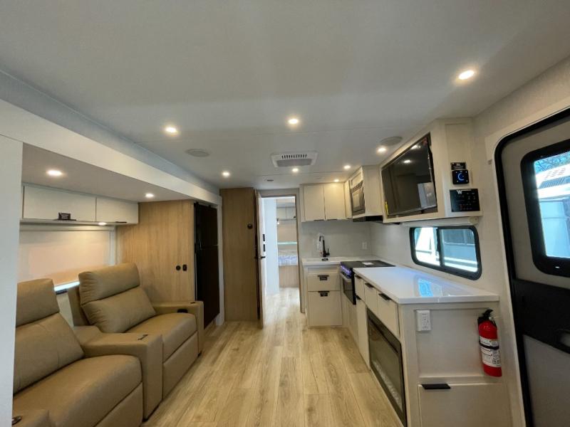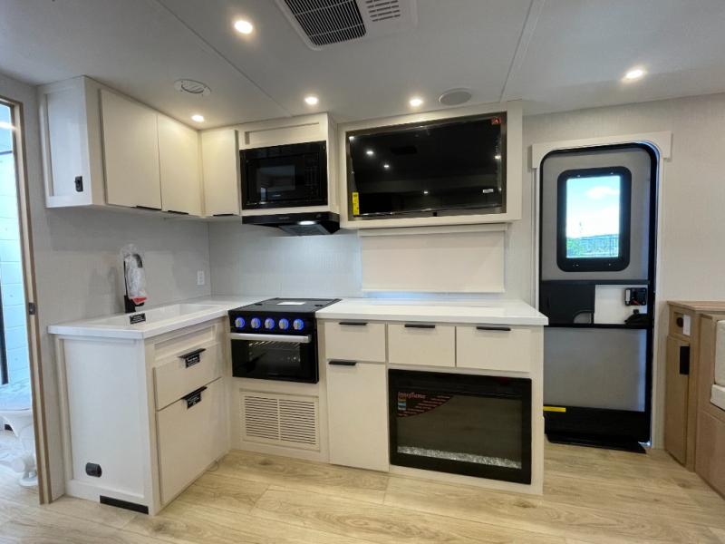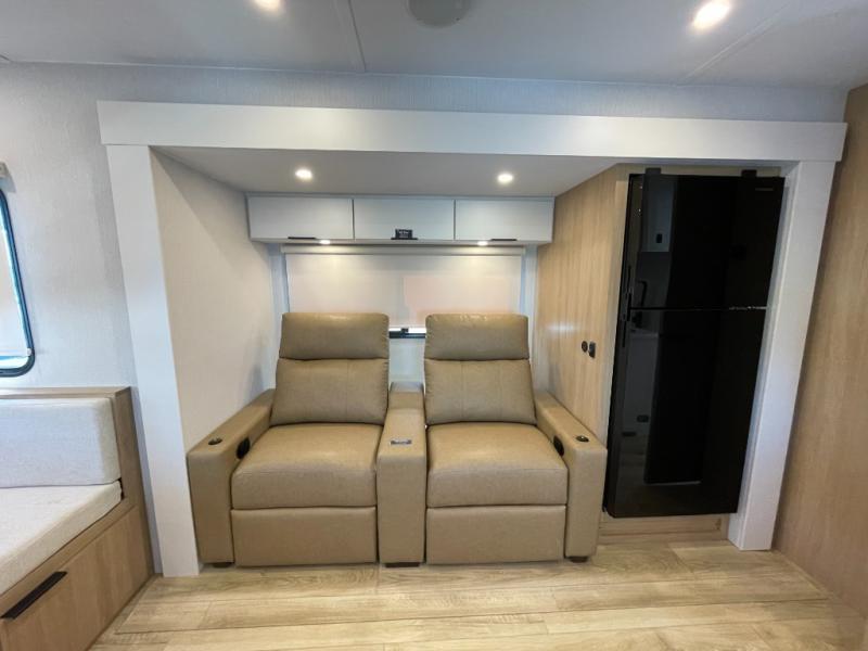 The rear living space of this travel trailer offers a spacious and welcoming layout, perfect for relaxing or entertaining after a day of adventure. In the main area there is a large 42" x 86" U-shaped dinette with plenty of room for meals, games or gathering to share stories. Beside there is theater seating located in the slide-out that adds extra comfort and seating space. Across, a cozy fireplace and TV making this the ideal spot for winding down in the evenings. The kitchen and appliances allow the chef to easily move around in the spacious living area. Moving forward, a pass-through bathroom adds convenience and privacy, leading to the front private bedroom. Here you'll find a spacious 66" x 80" Olympic Queen Bed, on each side wardrobes for ample storage. The bedroom also features a second exterior entry door, providing easy access without disturbing the main living area.