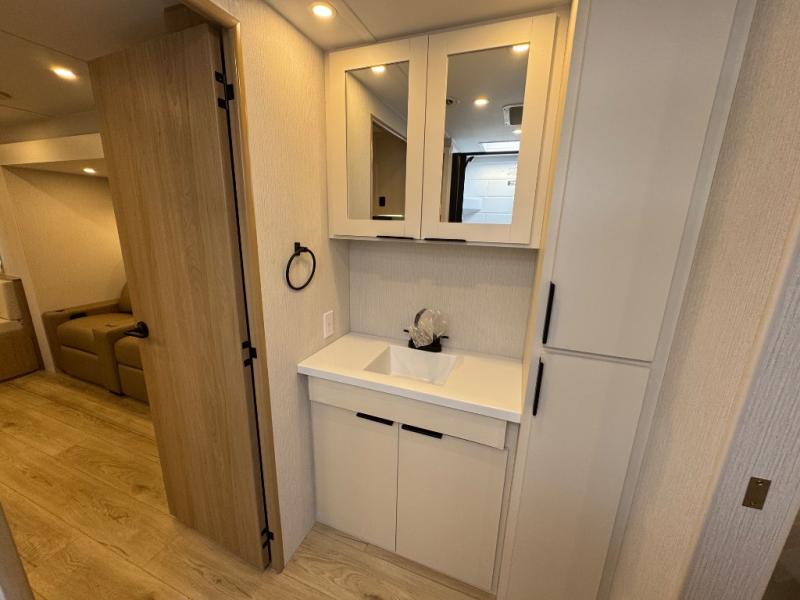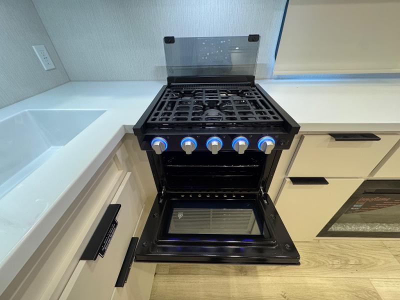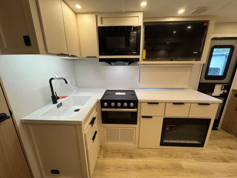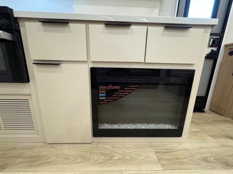 The rear living space of this travel trailer offers a spacious and welcoming layout, perfect for relaxing or entertaining after a day of adventure. In the main area there is a large 42" x 86" U-shaped dinette with plenty of room for meals, games or gathering to share stories. Beside there is theater seating located in the slide-out that adds extra comfort and seating space. Across, a cozy fireplace and TV making this the ideal spot for winding down in the evenings. The kitchen and appliances allow the chef to easily move around in the spacious living area. Moving forward, a pass-through bathroom adds convenience and privacy, leading to the front private bedroom. Here you'll find a spacious 66" x 80" Olympic Queen Bed, on each side wardrobes for ample storage. The bedroom also features a second exterior entry door, providing easy access without disturbing the main living area.