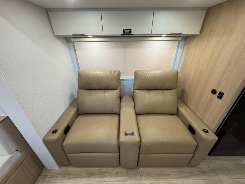 With any Thrive travel trailer by Winnebago, you can camp with functionality, comfort, and convenience! The large front viewing window with strike guard will be the first thing that catches your eye, and the fiberglass sidewalls with Azdel Onboard provide a durable trailer made to last. There is also an exterior ladder, along with front radius profile lights, power stabilizer jacks, and a powered awning with LED lighting to name a few exterior features. You will stay powered up by the 30-amp power cord and 200-watt solar panel, plus there is a tankless water heater for endless hot showers. Inside, you'll love the custom Winnebago furniture, carpetless side outs, molded fiberglass countertops, and residential recessed ceiling lights to keep your space well lit!