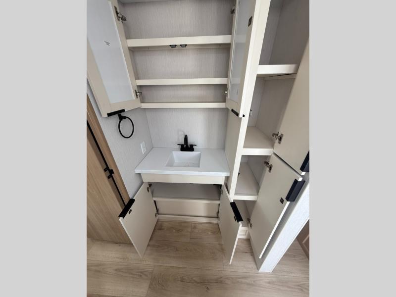 The rear living space of this travel trailer offers a spacious and welcoming layout, perfect for relaxing or entertaining after a day of adventure. In the main area three is a large 42" x 86" U-shaped dinette, with plenty of room for meals, games or gathering to share stories. Beside there is theater seating located in the slide-out that adds extra comfort and seating space. Across, a cozy fireplace and TV making this the ideal spot for winding down in the evenings. The kitchen and appliances allow the chef to easily move around in the spacious living area. Moving forward, a pass-through bathroom adds convenience and privacy, leading to the front private bedroom. Here you'll find a spacious 66" x 80" Olympic Queen Bed, on each side wardrobes for ample storage. The bedroom also features a second exterior entry door, providing easy access without disturbing the main living area.