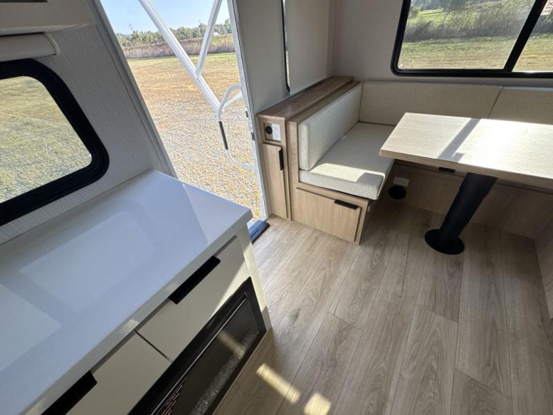 The rear living space of this travel trailer offers a spacious and welcoming layout, perfect for relaxing or entertaining after a day of adventure. In the main area three is a large 42" x 86" U-shaped dinette, with plenty of room for meals, games or gathering to share stories. Beside there is theater seating located in the slide-out that adds extra comfort and seating space. Across, a cozy fireplace and TV making this the ideal spot for winding down in the evenings. The kitchen and appliances allow the chef to easily move around in the spacious living area. Moving forward, a pass-through bathroom adds convenience and privacy, leading to the front private bedroom. Here you'll find a spacious 66" x 80" Olympic Queen Bed, on each side wardrobes for ample storage. The bedroom also features a second exterior entry door, providing easy access without disturbing the main living area.