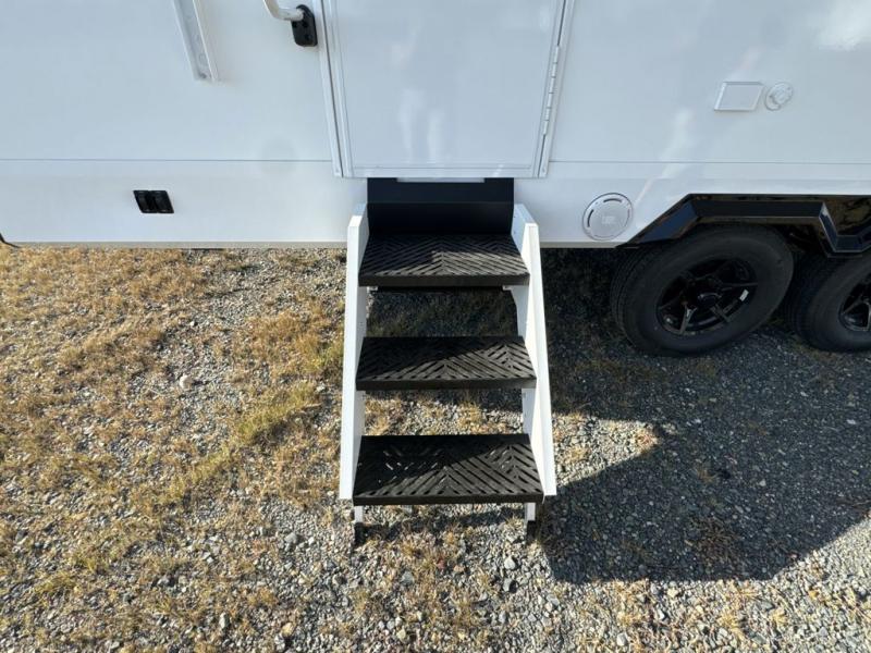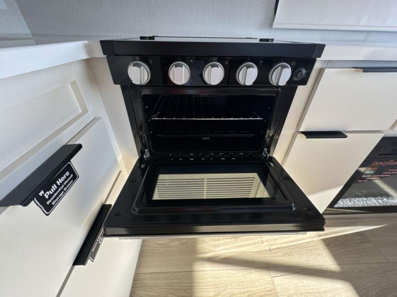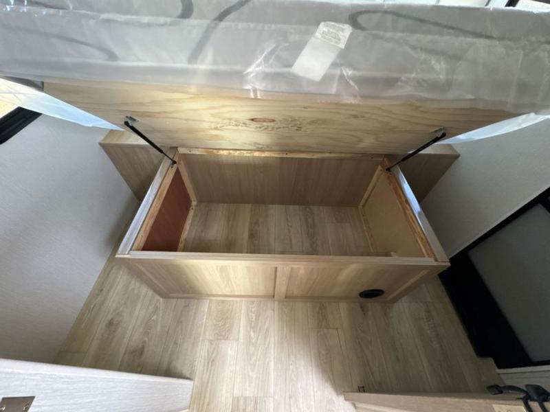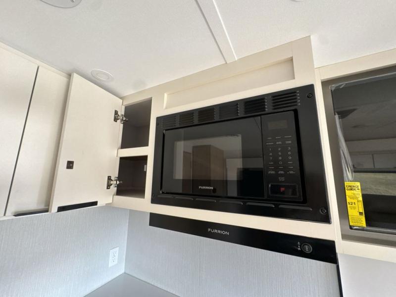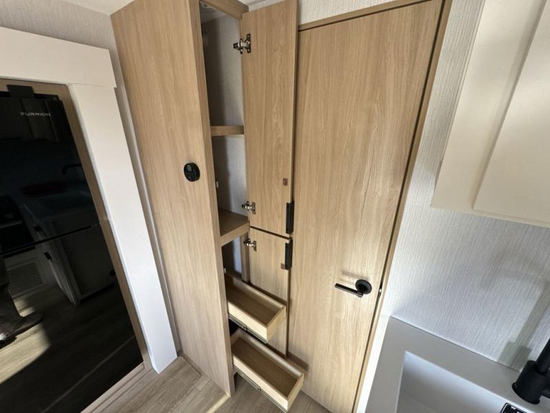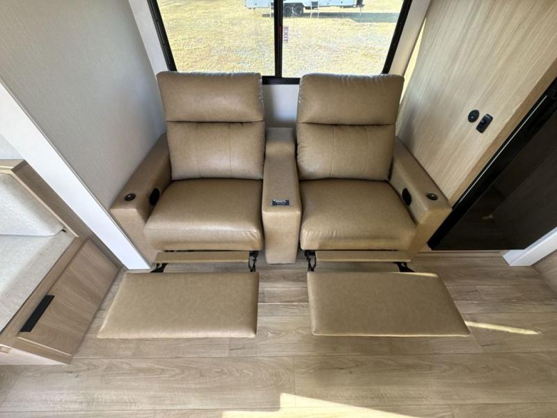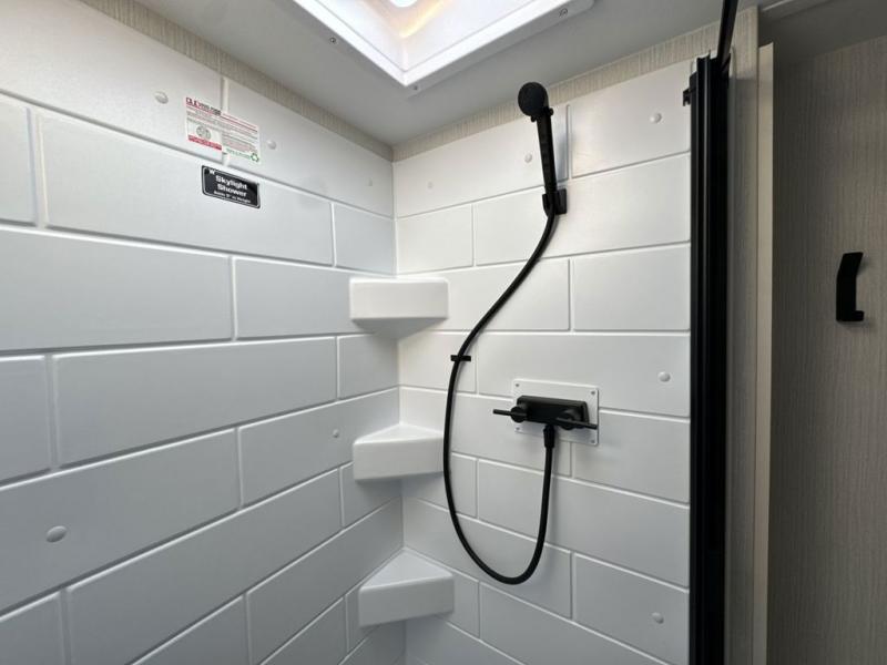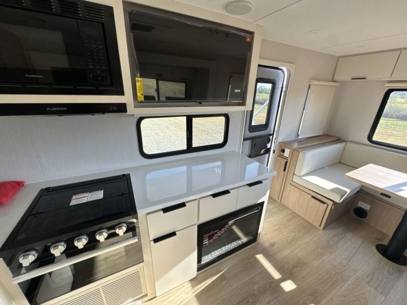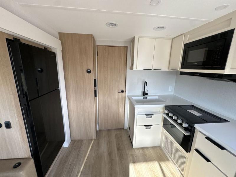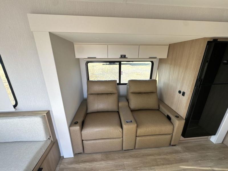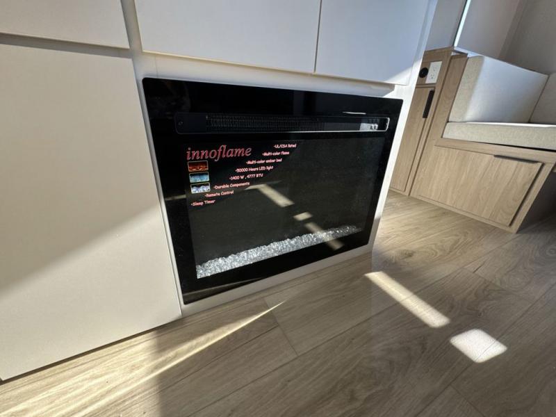 The rear living space of this travel trailer offers a spacious and welcoming layout, perfect for relaxing or entertaining after a day of adventure. In the main area three is a large 42" x 86" U-shaped dinette, with plenty of room for meals, games or gathering to share stories. Beside there is theater seating located in the slide-out that adds extra comfort and seating space. Across, a cozy fireplace and TV making this the ideal spot for winding down in the evenings. The kitchen and appliances allow the chef to easily move around in the spacious living area. Moving forward, a pass-through bathroom adds convenience and privacy, leading to the front private bedroom. Here you'll find a spacious 66" x 80" Olympic Queen Bed, on each side wardrobes for ample storage. The bedroom also features a second exterior entry door, providing easy access without disturbing the main living area.
