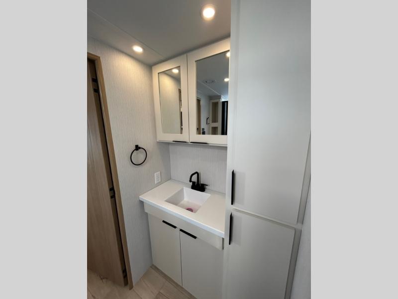 Full Bathroom: A spacious bathroom with shower, vanity, and toilet adds everyday convenience while camping