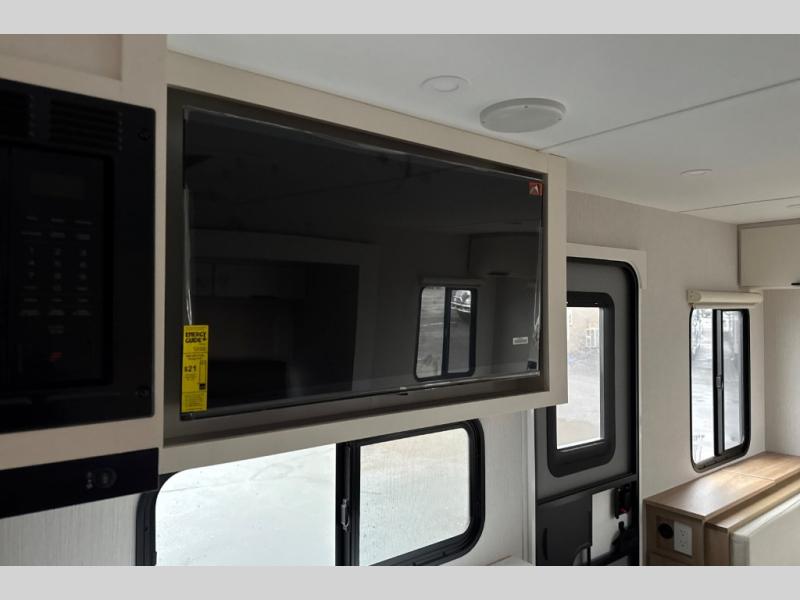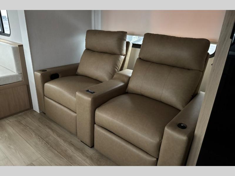 The rear living space of this travel trailer offers a spacious and welcoming layout, perfect for relaxing or entertaining after a day of adventure. In the main area there is a large 42" x 86" U-shaped dinette with plenty of room for meals, games or gathering to share stories. Beside there is theater seating located in the slide-out that adds extra comfort and seating space. Across, a cozy fireplace and TV making this the ideal spot for winding down in the evenings. The kitchen and appliances allow the chef to easily move around in the spacious living area. Moving forward, a pass-through bathroom adds convenience and privacy, leading to the front private bedroom. Here you'll find a spacious 66" x 80" Olympic Queen Bed, on each side wardrobes for ample storage. The bedroom also features a second exterior entry door, providing easy access without disturbing the main living area.