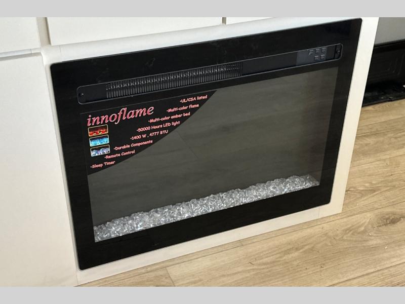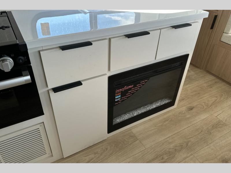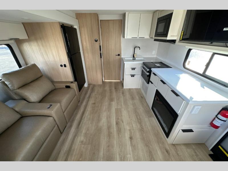 The rear living space of this travel trailer offers a spacious and welcoming layout, perfect for relaxing or entertaining after a day of adventure. In the main area there is a large 42" x 86" U-shaped dinette with plenty of room for meals, games or gathering to share stories. Beside there is theater seating located in the slide-out that adds extra comfort and seating space. Across, a cozy fireplace and TV making this the ideal spot for winding down in the evenings. The kitchen and appliances allow the chef to easily move around in the spacious living area. Moving forward, a pass-through bathroom adds convenience and privacy, leading to the front private bedroom. Here you'll find a spacious 66" x 80" Olympic Queen Bed, on each side wardrobes for ample storage. The bedroom also features a second exterior entry door, providing easy access without disturbing the main living area.