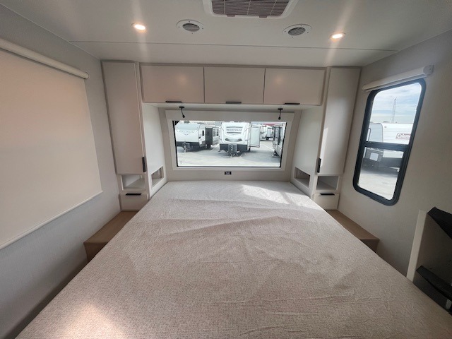 The rear living space of this travel trailer offers a spacious and welcoming layout, perfect for relaxing or entertaining after a day of adventure. In the main area there is a large 42" x 86" U-shaped dinette with plenty of room for meals, games or gathering to share stories. Beside there is theater seating located in the slide-out that adds extra comfort and seating space. Across, a cozy fireplace and TV making this the ideal spot for winding down in the evenings. The kitchen and appliances allow the chef to easily move around in the spacious living area. Moving forward, a walk-thru bathroom adds convenience and privacy, leading to the front private bedroom. Here you'll find a spacious 66" x 80" Olympic Queen Bed with wardrobes on each side for ample storage. The bedroom also features a second exterior entry door, providing easy access without disturbing the main living area.