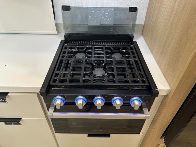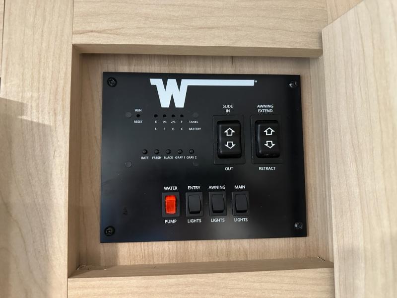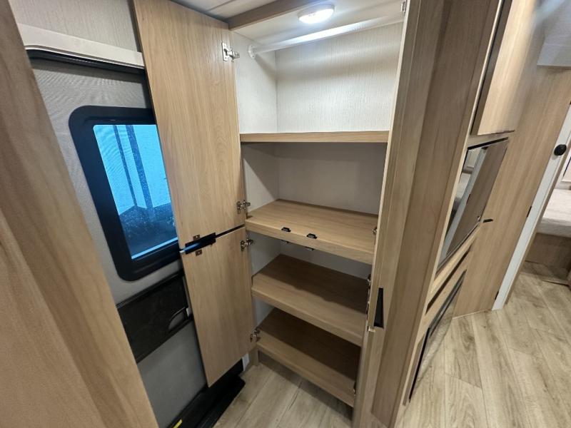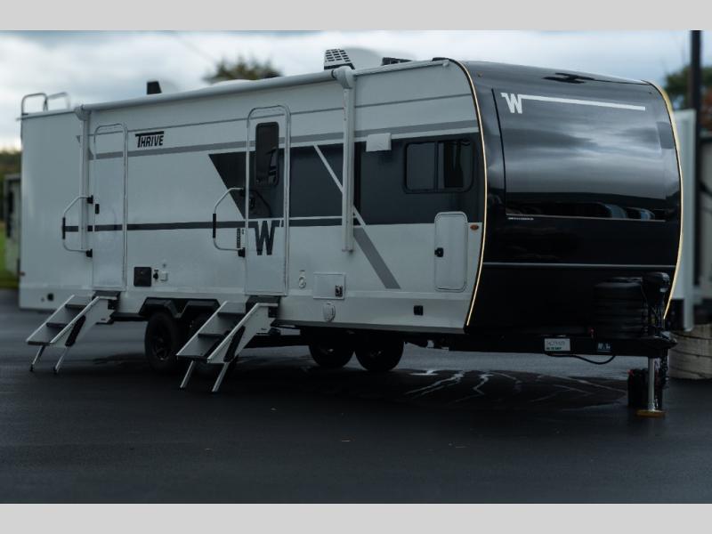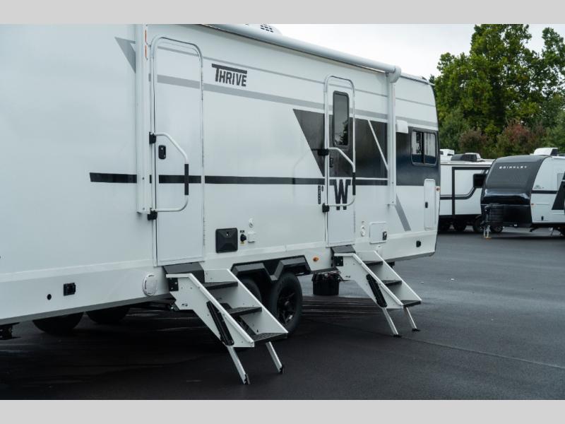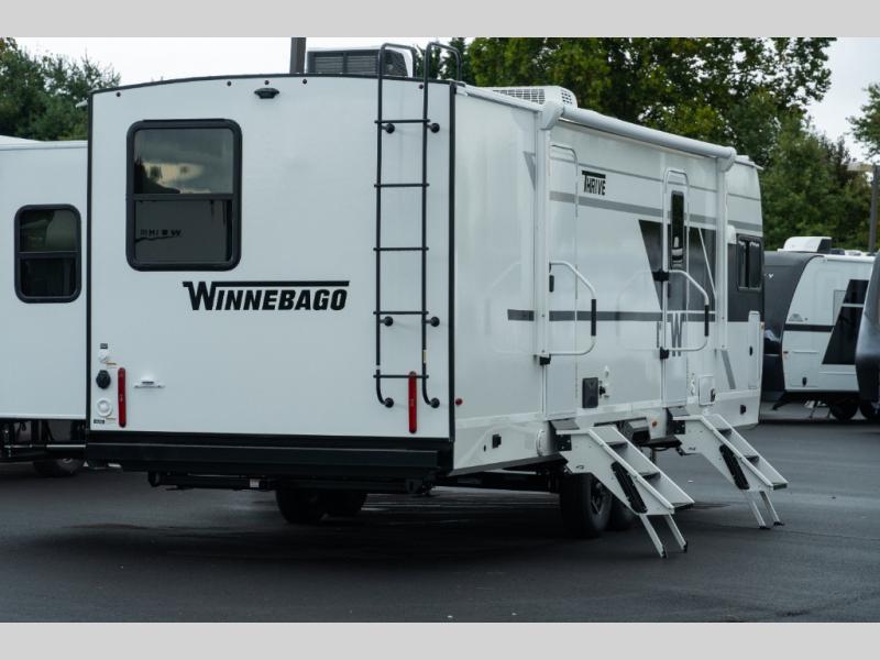 With any Thrive travel trailer by Winnebago, you can camp with functionality, comfort, and convenience! The large front viewing window with strike guard will be the first thing that catches your eye, and the fiberglass sidewalls with Azdel Onboard provide a durable trailer made to last. There is also an exterior ladder, along with front radius profile lights, power stabilizer jacks, and a powered awning with LED lighting to name a few exterior features. You will stay powered up by the 30-amp power cord and 200-watt solar panel, plus there is a tankless water heater for endless hot showers. Inside, you'll love the custom Winnebago furniture, carpetless side outs, molded fiberglass countertops, and residential recessed ceiling lights to keep your space well lit!