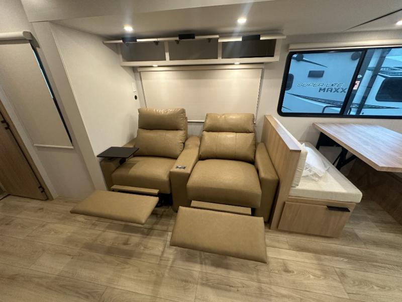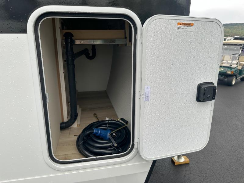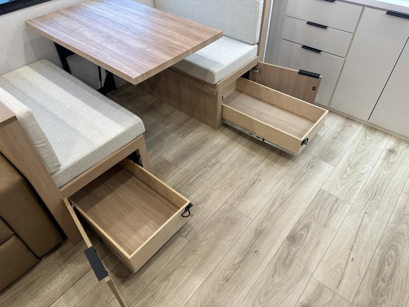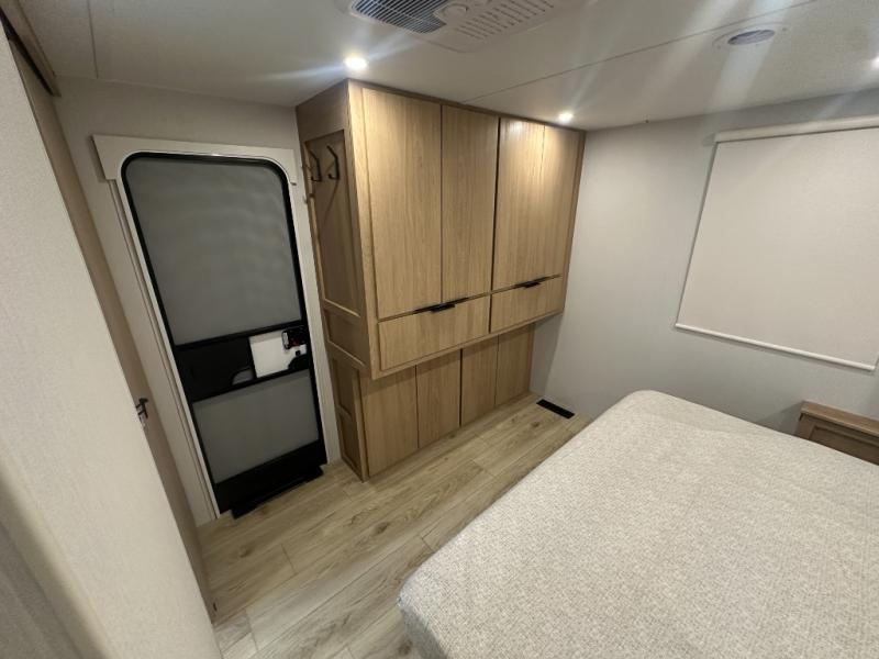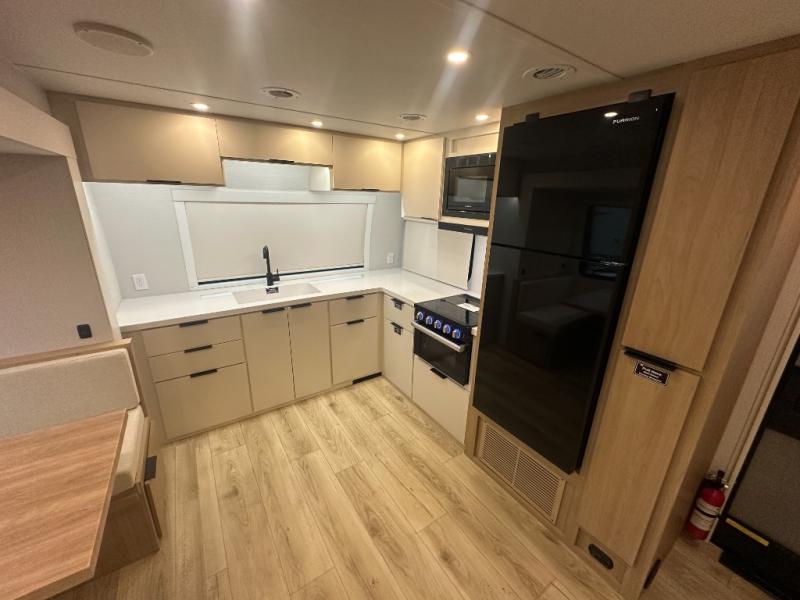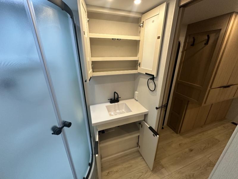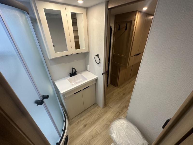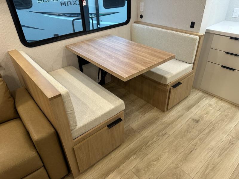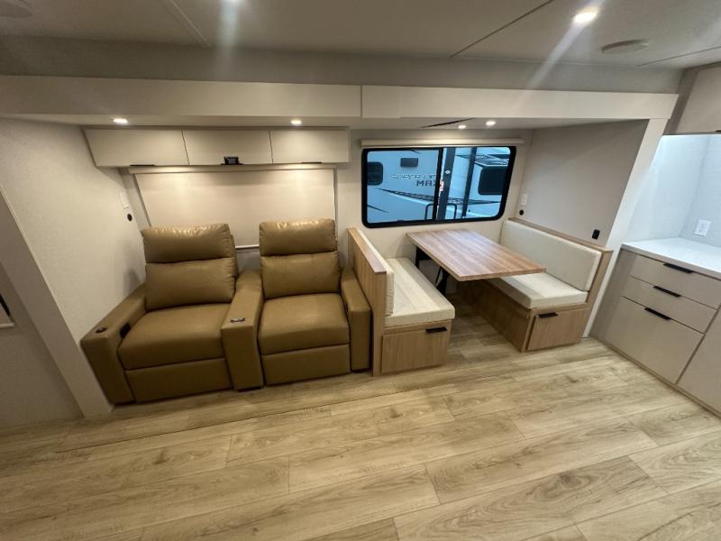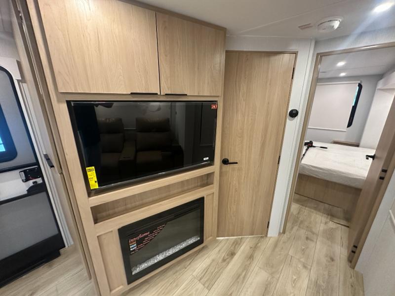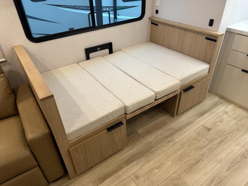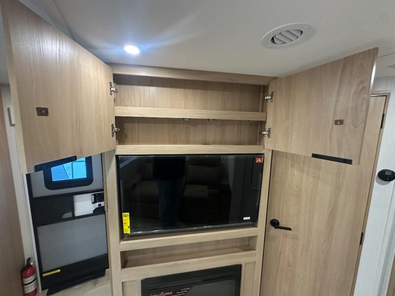 Have everything you need in a compact and well equipped travel trailer. After entering the travel trailer you will find neat places and storage to have everything in place. There is a galley kitchen with molded fiberglass countertops providing unmatched durability. When wanting a perfect place to relax you can enjoy watching TV in the booth dinette or enjoy movies just like at the theaters in the theater seating. If you want to have your own private space you will love the bedroom that has access to a conveniently placed bathroom with a modern radius shower. The bedroom also has a closet to store all your clothes and keep them wrinkle-free!
