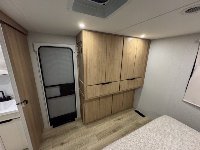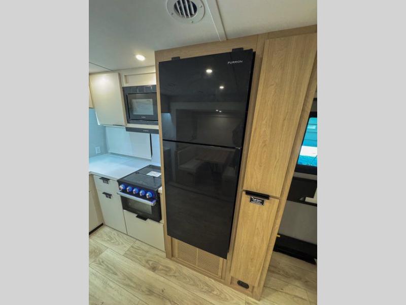 Have everything you need in a compact and well equipped travel trailer. After entering the travel trailer you will find neat places and storage. There is a galley kitchen with molded fiberglass countertops providing unmatched durability. When wanting a perfect place to relax you can enjoy watching TV in the booth dinette or enjoy movies just like at the theaters in the theater seating. If you want to have your own private space you will love the bedroom that has access to a conveniently placed bathroom with a modern radius shower. The bedroom also has a closet to store all your clothes and keep them wrinkle-free!