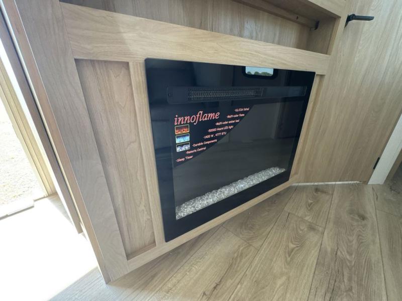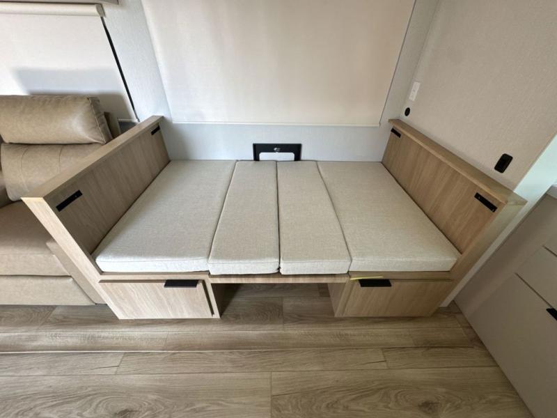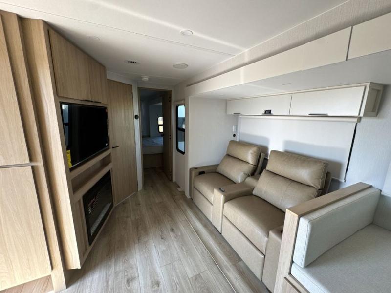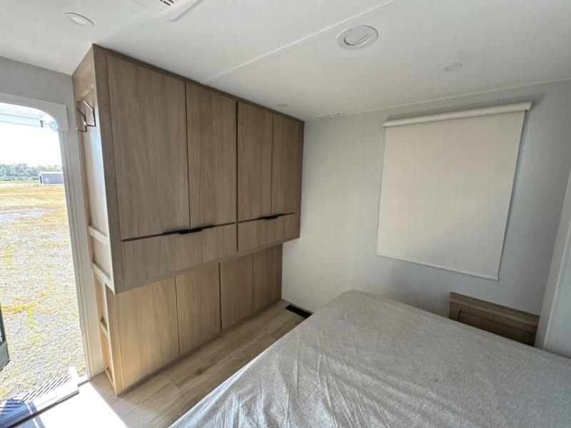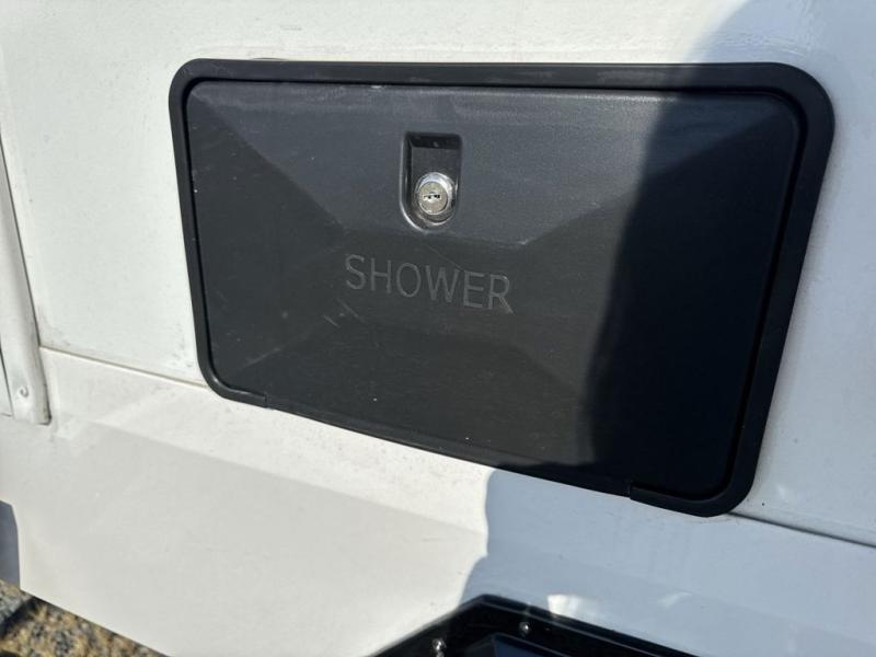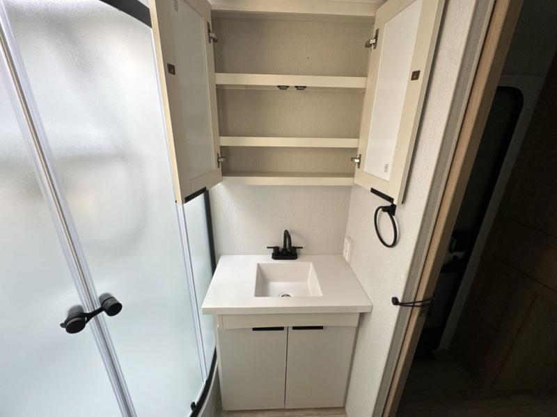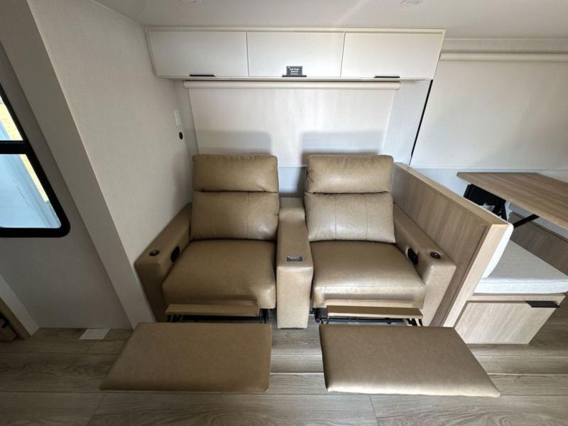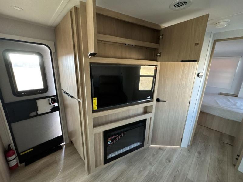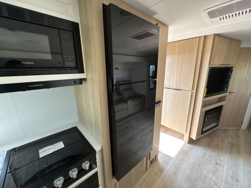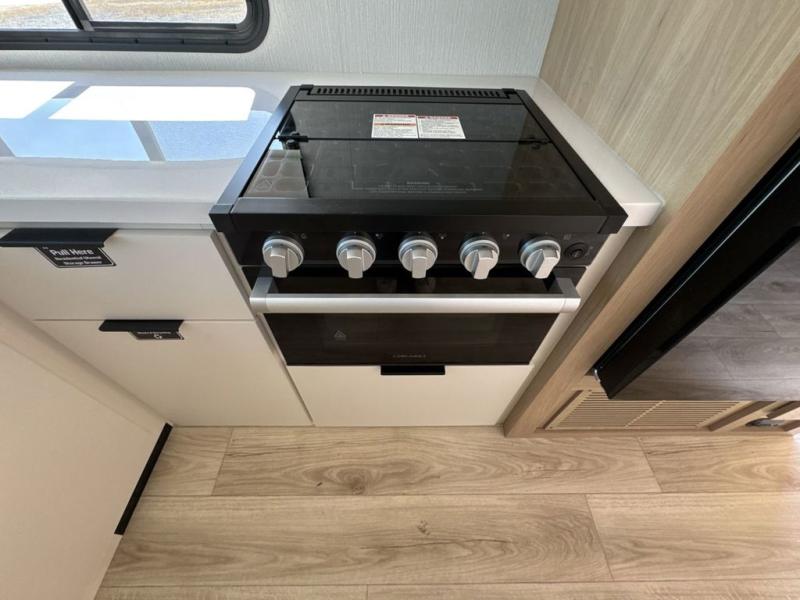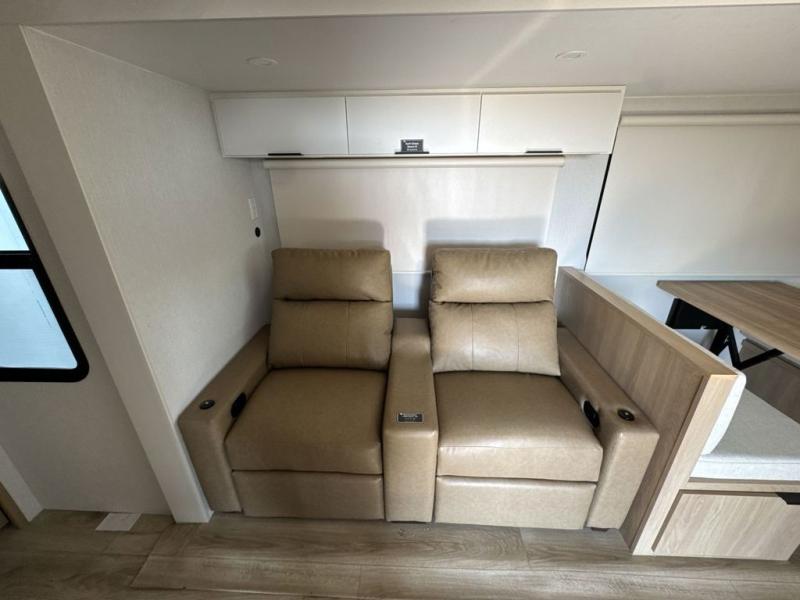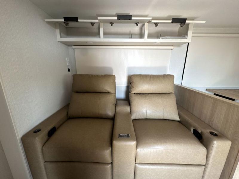 Have everything you need in a compact and well equipped travel trailer. After entering the travel trailer you will find neat places and storage. There is a galley kitchen with molded fiberglass countertops providing unmatched durability. When wanting a perfect place to relax you can enjoy watching TV in the booth dinette or enjoy movies just like at the theaters in the theater seating. If you want to have your own private space you will love the bedroom that has access to a conveniently placed bathroom with a modern radius shower. The bedroom also has a closet to store all your clothes and keep them wrinkle-free!
