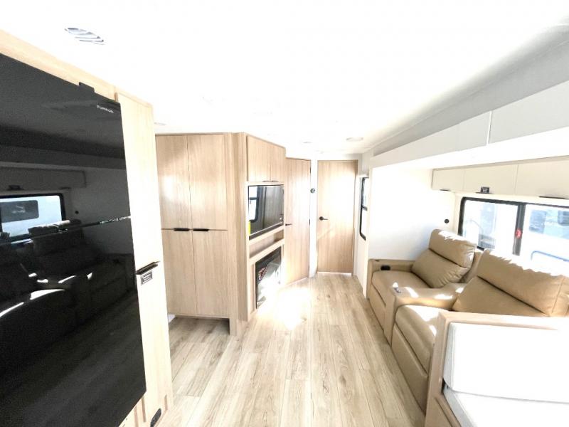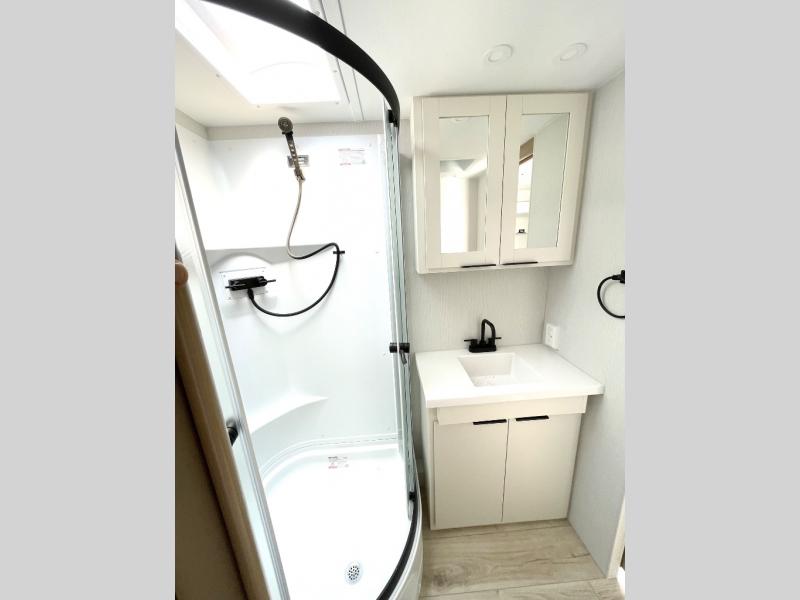 With any Thrive travel trailer by Winnebago, you can camp with functionality, comfort, and convenience! The large front viewing window with strike guard will be the first thing that catches your eye, and the fiberglass sidewalls with Azdel Onboard provide a durable trailer made to last. There is also an exterior ladder, along with front radius profile lights, power stabilizer jacks, and a powered awning with LED lighting to name a few exterior features. You will stay powered up by the 30-amp power cord and 200-watt solar panel, plus there is a tankless water heater for endless hot showers. Inside, you'll love the custom Winnebago furniture, carpetless side outs, molded fiberglass countertops, and residential recessed ceiling lights to keep your space well lit!