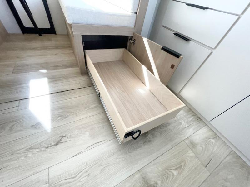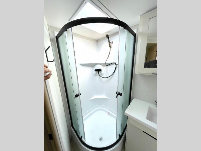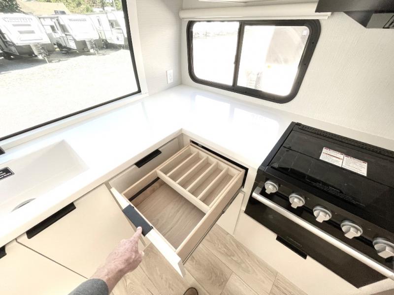 Have everything you need in a compact and well equipped travel trailer. After entering the travel trailer you will find neat places and storage. There is a galley kitchen with molded fiberglass countertops providing unmatched durability. When wanting a perfect place to relax you can enjoy watching TV in the booth dinette or enjoy movies just like at the theaters in the theater seating. If you want to have your own private space you will love the bedroom that has access to a conveniently placed bathroom with a modern radius shower. The bedroom also has a closet to store all your clothes and keep them wrinkle-free!