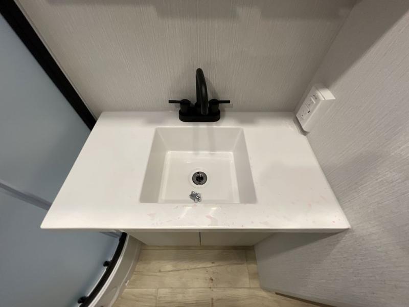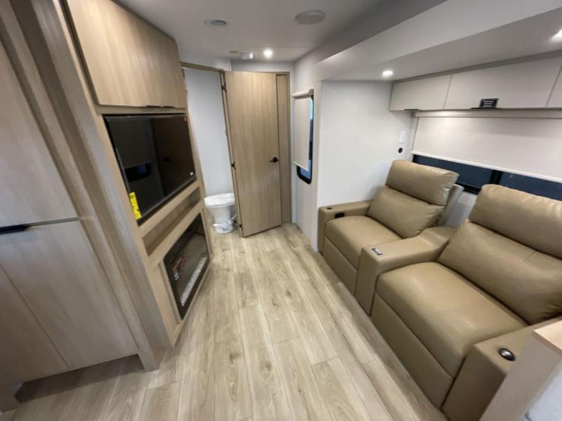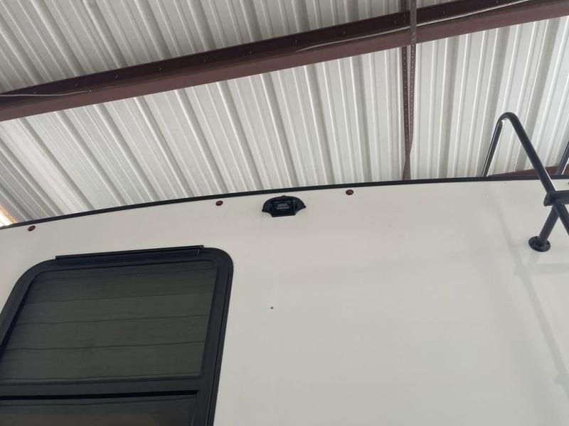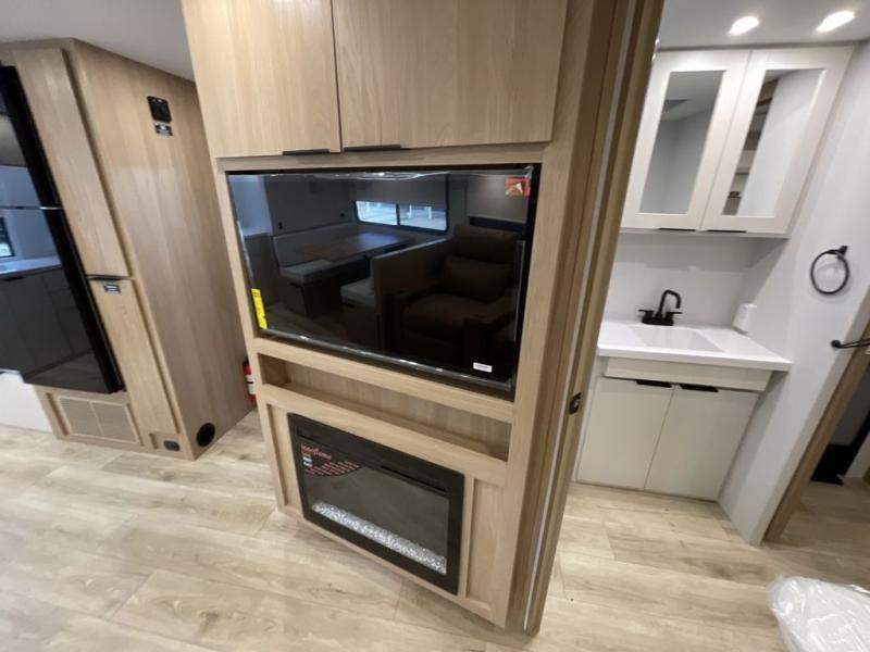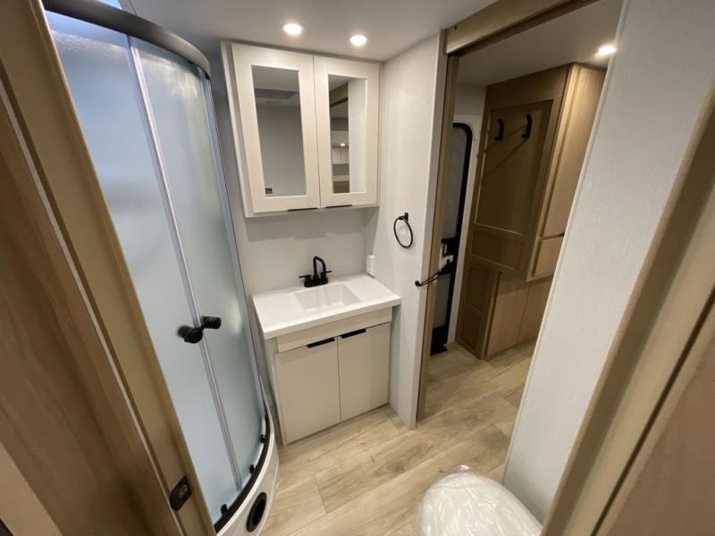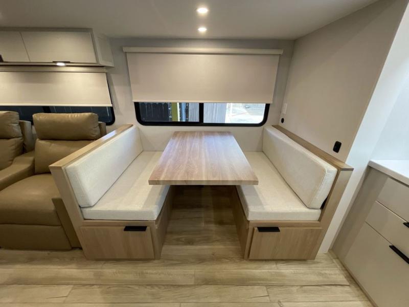 Have everything you need in a compact and well equipped travel trailer. After entering the travel trailer you will find neat places and storage. There is a galley kitchen with molded fiberglass countertops providing unmatched durability. When wanting a perfect place to relax you can enjoy watching TV in the booth dinette or enjoy movies just like at the theaters in the theater seating. If you want to have your own private space you will love the bedroom that has access to a conveniently placed bathroom with a modern radius shower. The bedroom also has a closet to store all your clothes and keep them wrinkle-free!