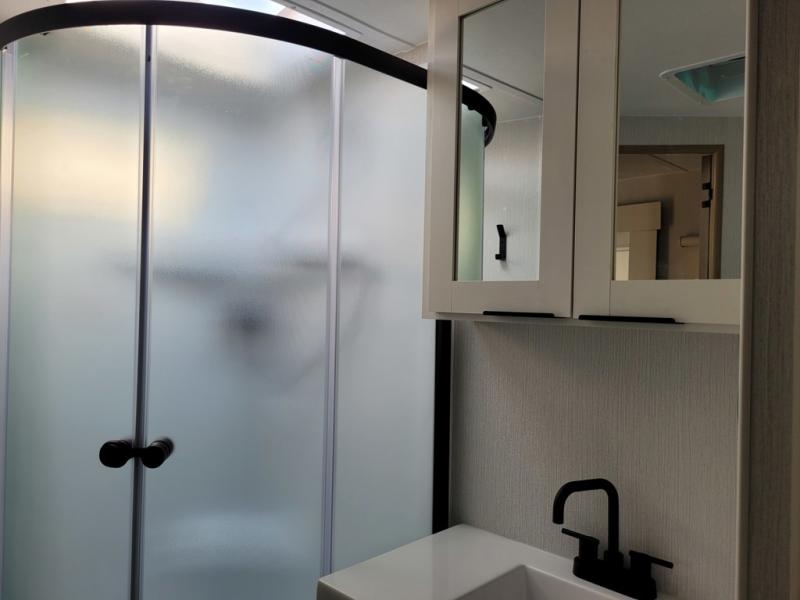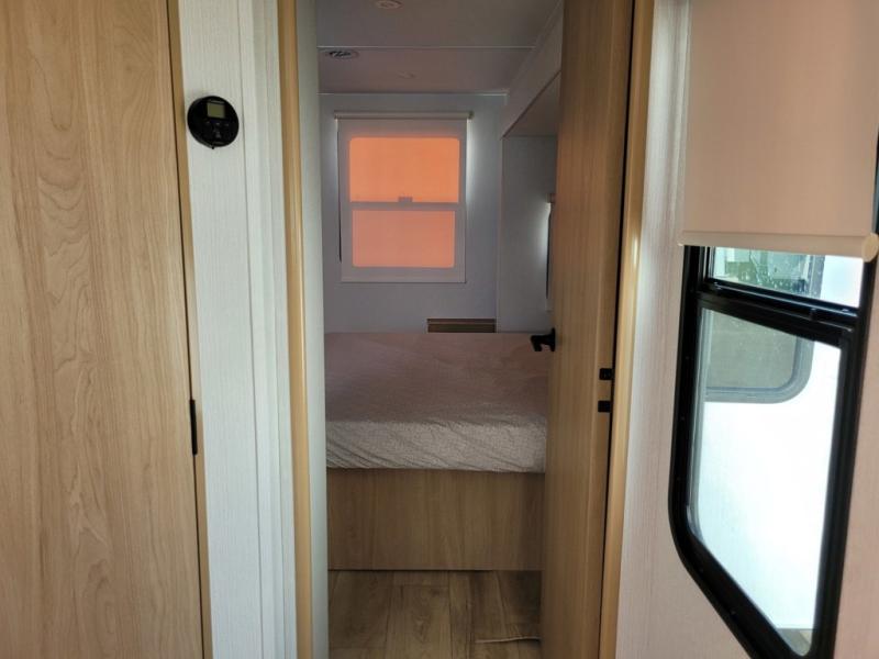 Have everything you need in a compact and well equipped travel trailer. After entering the travel trailer you will find neat places and storage to have everything in place. There is a galley kitchen with molded fiberglass countertops providing unmatched durability. When wanting a perfect place to relax you can enjoy watching TV in the booth dinette or enjoy movies just like at the theaters in the theater seating. If you want to have your own private space you will love the bedroom that has access to a conveniently placed bathroom with a modern radius shower. The bedroom also has a closet to store all your clothes and keep them wrinkle-free!