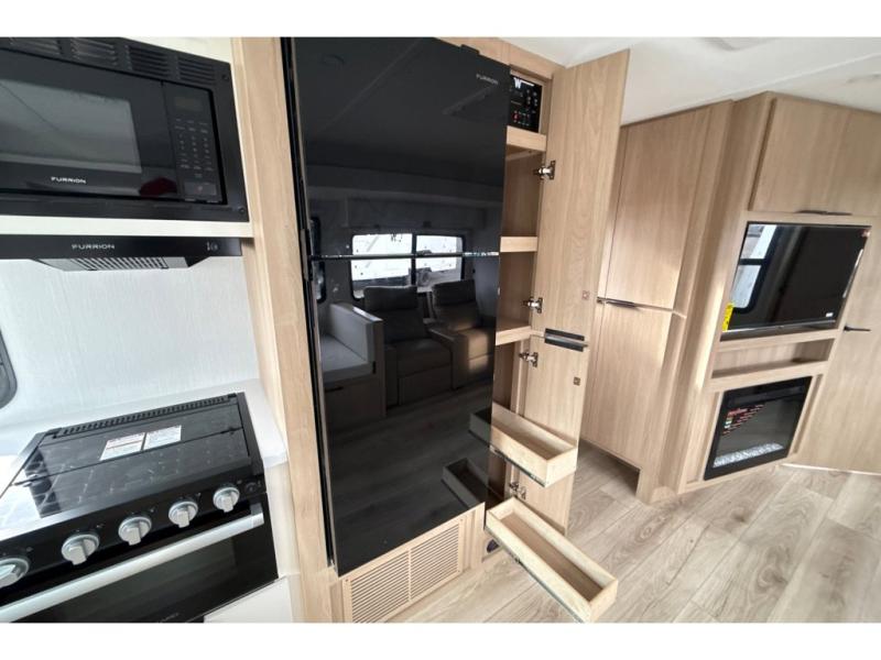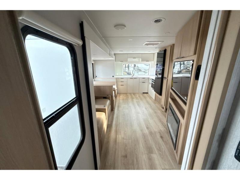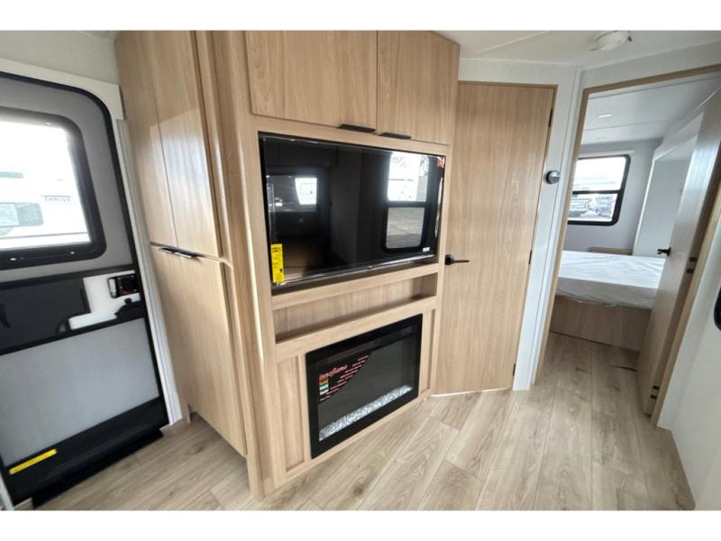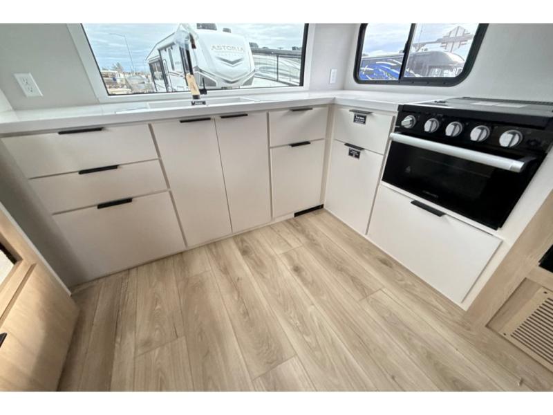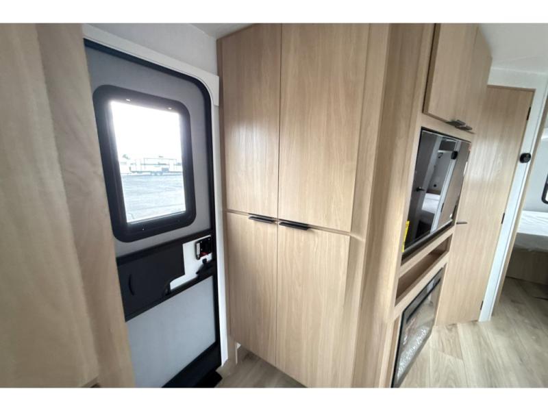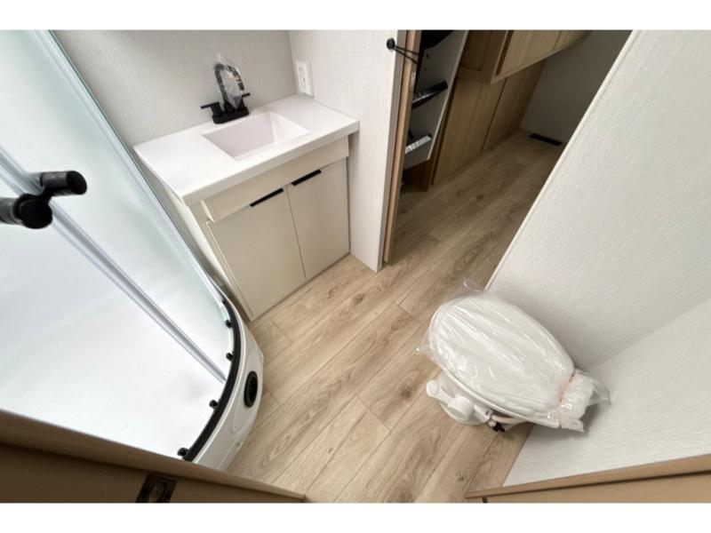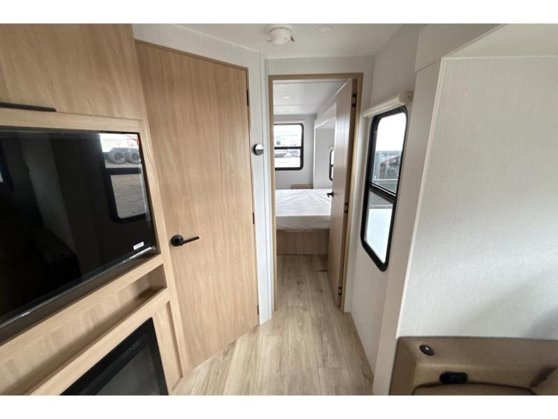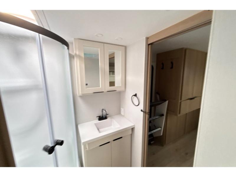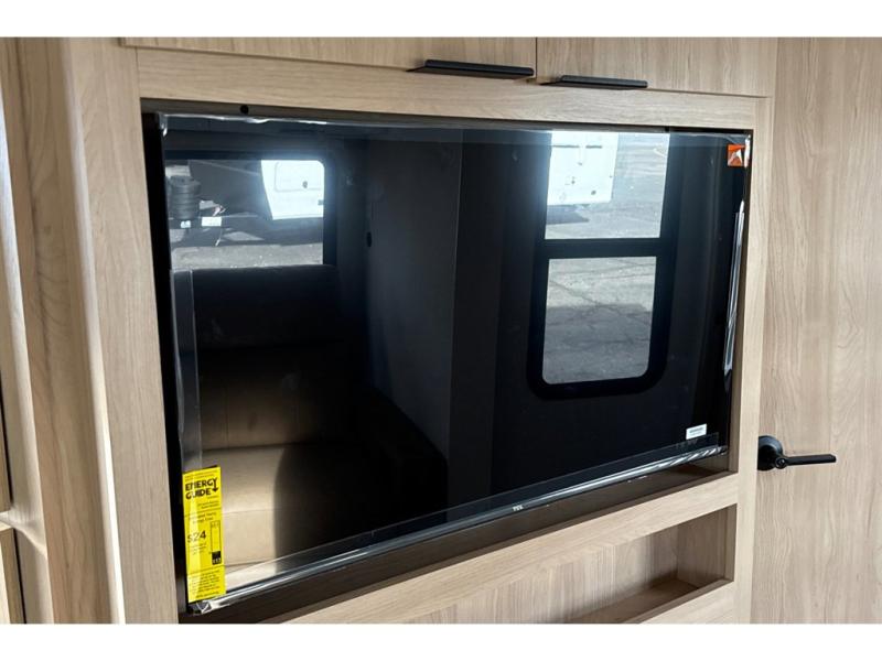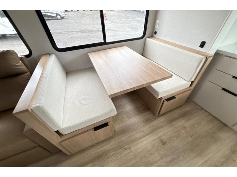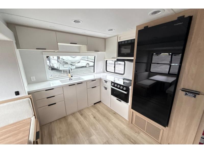 Have everything you need in a compact and well equipped travel trailer. After entering the travel trailer you will find neat places and storage to have everything in place. There is a galley kitchen with molded fiberglass countertops providing unmatched durability. When wanting a perfect place to relax you can enjoy watching TV in the booth dinette or enjoy movies just like at the theaters in the theater seating. If you want to have your own private space you will love the bedroom that has access to a conveniently placed bathroom with a modern radius shower. The bedroom also has a closet to store all your clothes and keep them wrinkle-free!