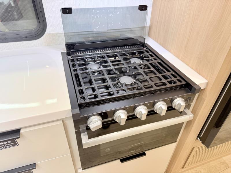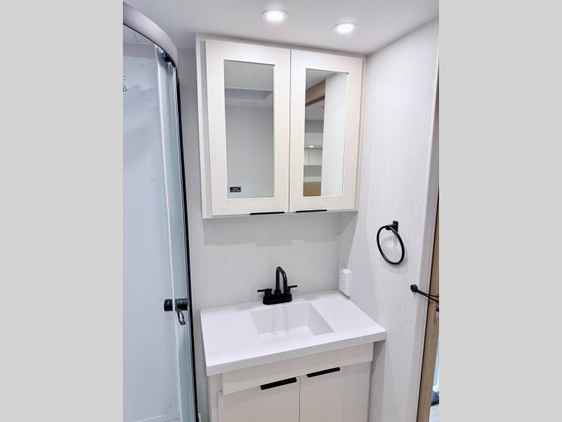 With any Thrive travel trailer by Winnebago, you can camp with functionality, comfort, and convenience! The large front viewing window with strike guard will be the first thing that catches your eye, and the fiberglass sidewalls with Azdel Onboard provide a durable trailer made to last. There is also an exterior ladder, along with front radius profile lights, power stabilizer jacks, and a powered awning with LED lighting to name a few exterior features. You will stay powered up by the 30-amp power cord and 200-watt solar panel, plus there is a tankless water heater for endless hot showers. Inside, you'll love the custom Winnebago furniture, carpetless side outs, molded fiberglass countertops, and residential recessed ceiling lights to keep your space well lit!