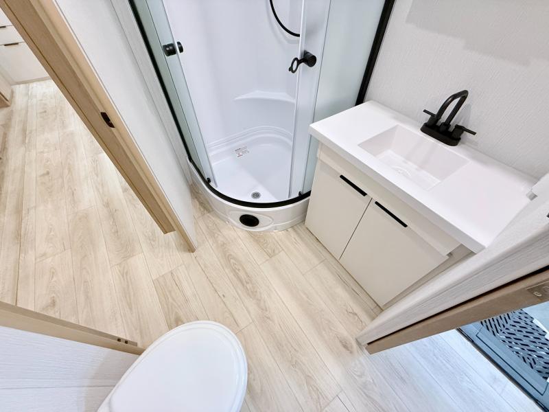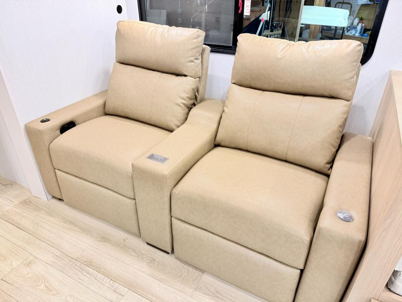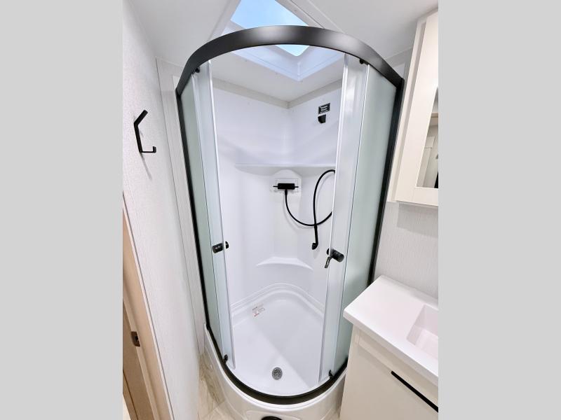 Have everything you need in a compact and well equipped travel trailer. After entering the travel trailer you will find neat places and storage to have everything in place. There is a galley kitchen with molded fiberglass countertops providing unmatched durability. When wanting a perfect place to relax you can enjoy watching TV in the booth dinette or enjoy movies just like at the theaters in the theater seating. If you want to have your own private space you will love the bedroom that has access to a conveniently placed bathroom with a modern radius shower. The bedroom also has a closet to store all your clothes and keep them wrinkle-free!