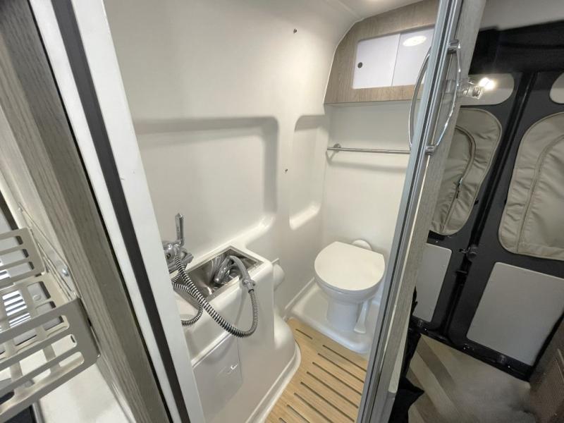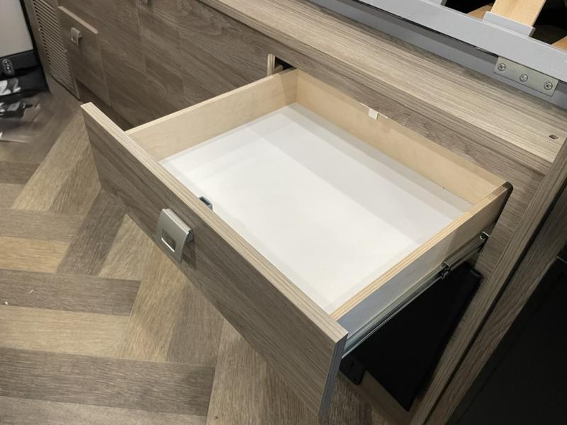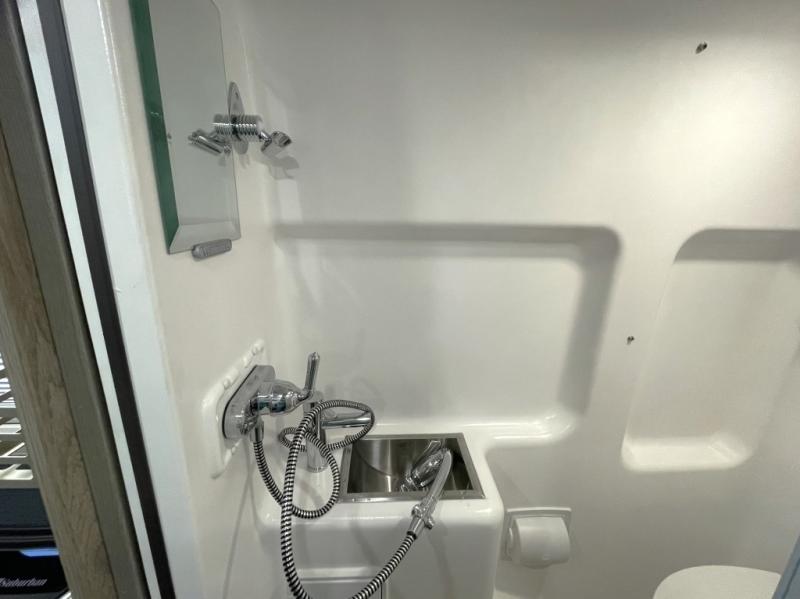 Fully Equipped Wet Bath: Stay fresh on the road with a 28" x 51" wet bath featuring a sliding door, fold-down sink, and built-in storage for towels and toiletries.