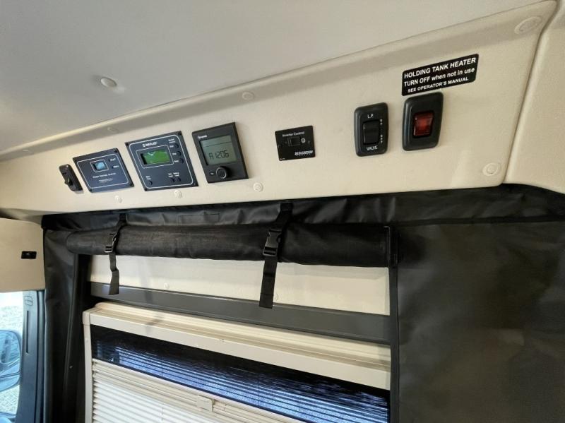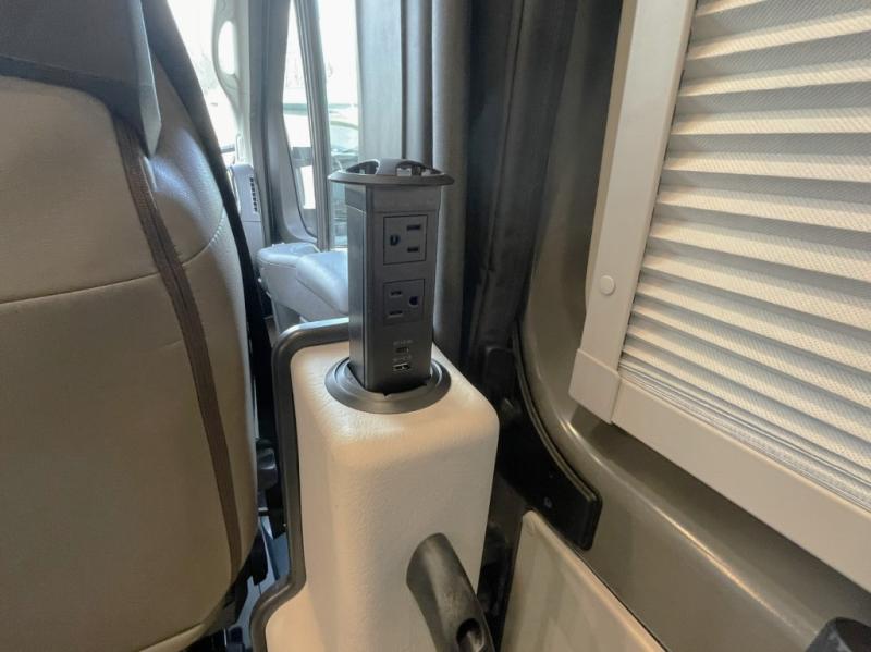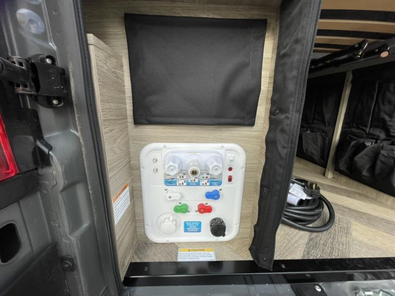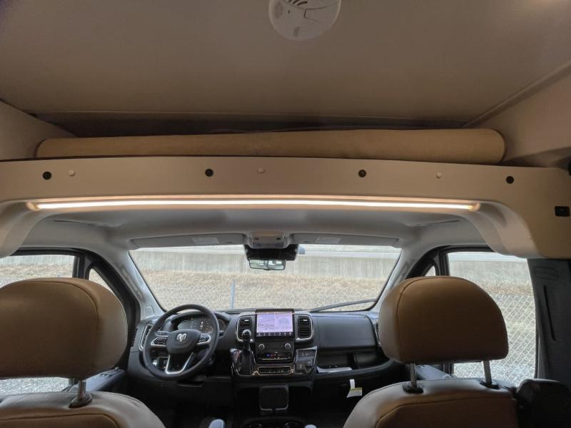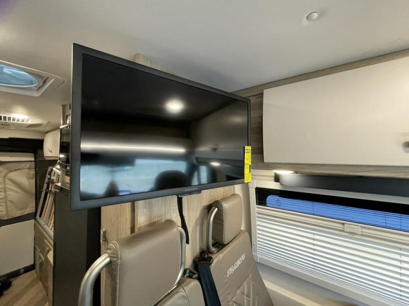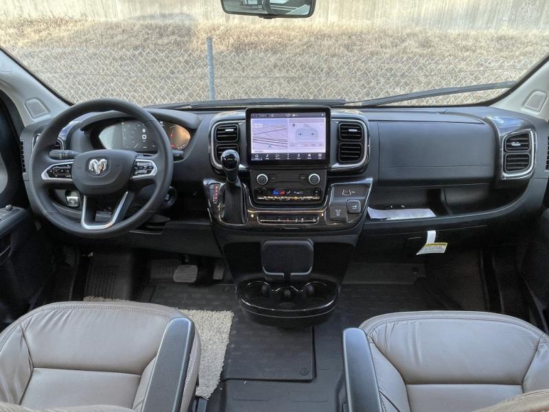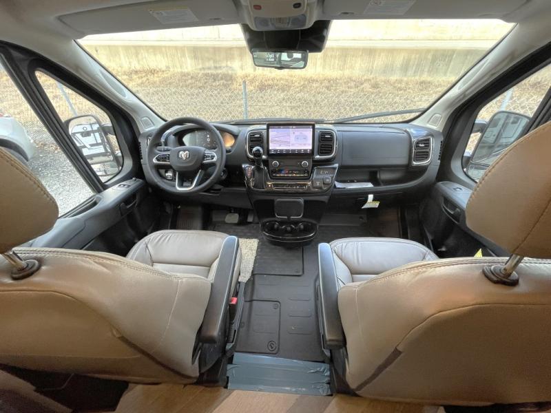 Inside, the Truma Combi G Comfort Plus heating system ensures year-round comfort using either propane or electricity, while tinted windows with blackout shades keep things private and cozy. Built for both comfort and durability, the Travato features aluminum running boards with logoed tread, ground-effect lighting, and RAM Tough-Track Mounts to secure your gear. Stay entertained and connected with a 24" HDTV, Bluetooth soundbar, and radio/rearview monitor system with navigation and USB ports.