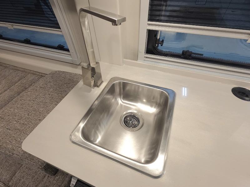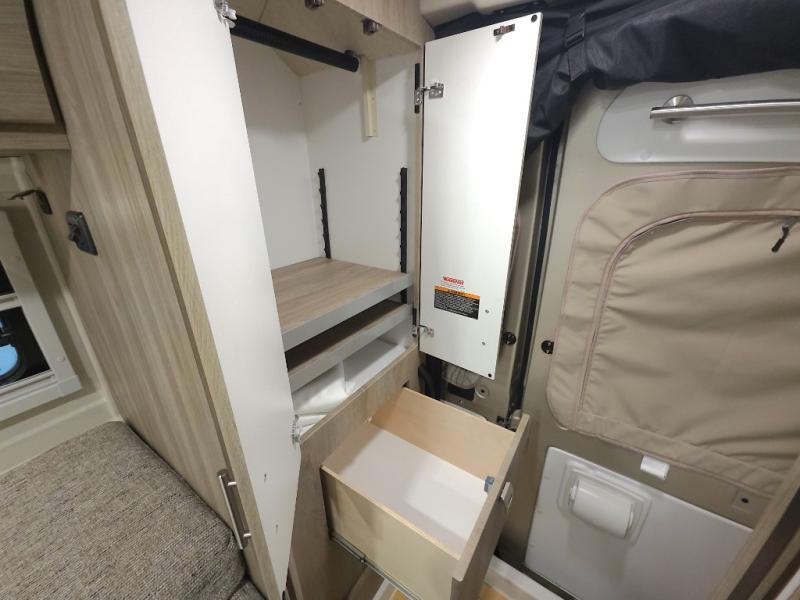 Rear Wet Bath: Freshen up in a thoughtfully designed 25" x 43" wet bath featuring a fold-down sink, wardrobe storage, and sliding privacy doors — functionality and comfort in one space.